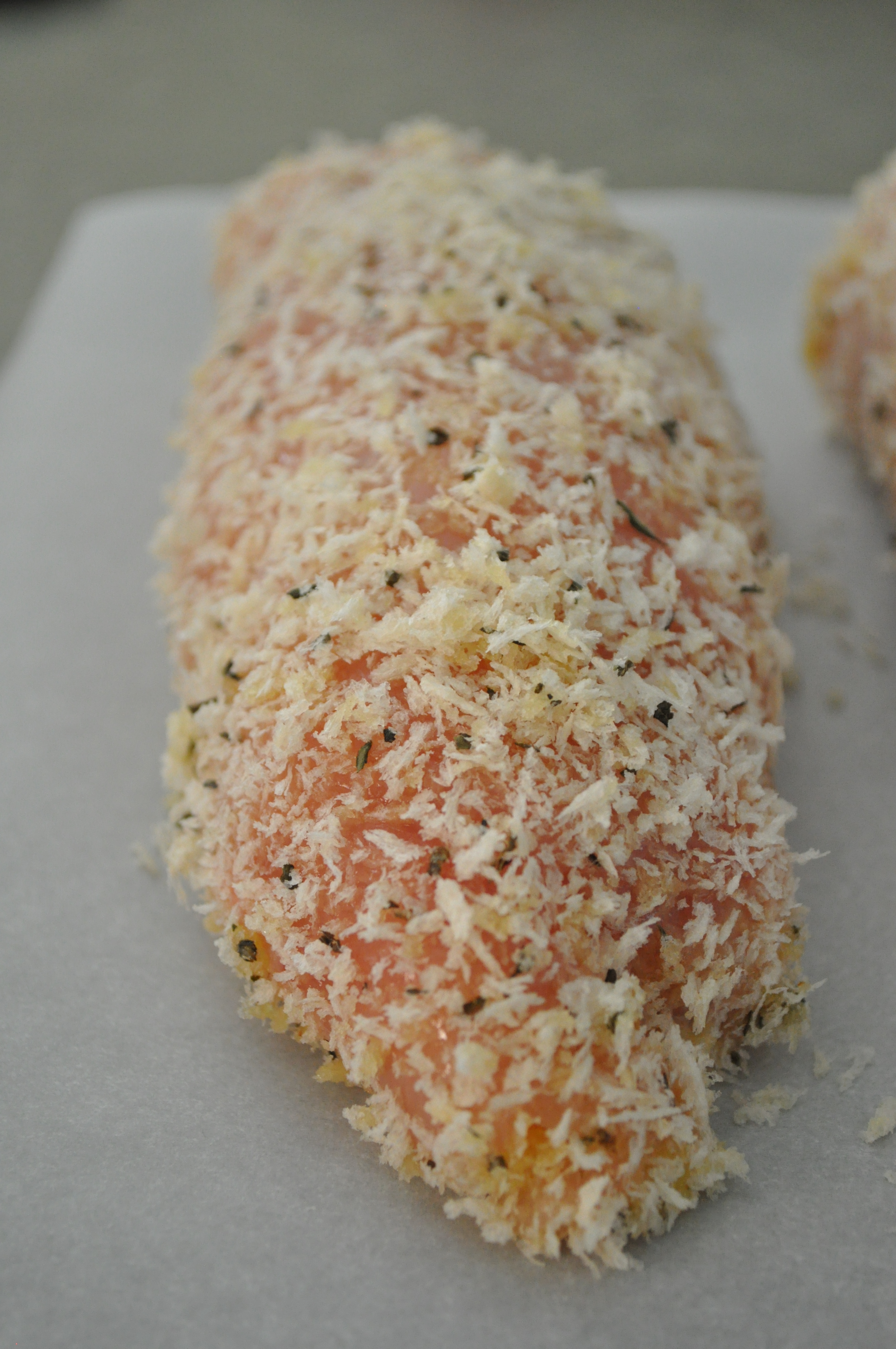 Spread the goat cheese evenly, leaving 1/2 inch edge on all sides, and roll, laying the chicken seam-side down. Beat two large eggs in a shallow dish. Carefully coat each chicken roll in the egg mixture, then in the seasoned bread crumbs. Lay seam side down on parchment paper.