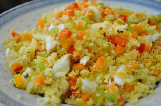 Drizzle the remaining 2 tsp olive oil in the skillet and keep on medium-high heat. Add the onions and saute until just starting to brown. While onions are cooking, flake the tilapia into pieces on the cutting board. Add the minced garlic to the onions and cook for 30 seconds. Add remaining veggies and toss for 30 seconds. You want them to get warmed but retain their crunch. Remove the skillet from the heat. Stir in the couscous and the dressing until mixed thoroughly. Last, add the flaked tilapia and gently stir to incorporate. Dish up and serve immediately.