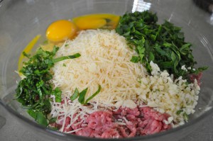 - In a large bowl, mix the ground beef with pork (if using. I didn’t this time.) Add the Parmesan cheese, parsley, basil, eggs and garlic. I would like to point out that the original recipe called for half of a BULB of garlic to be chopped both for the sauce AND the meatballs…Really?! An ENTIRE bulb of garlic for one meal?! I like garlic, but this seemed excessive. I cut it in half…which still seemed like a lot to me…but I’ll share more on that later. My ingredients list above is much more conservative on the garlic.