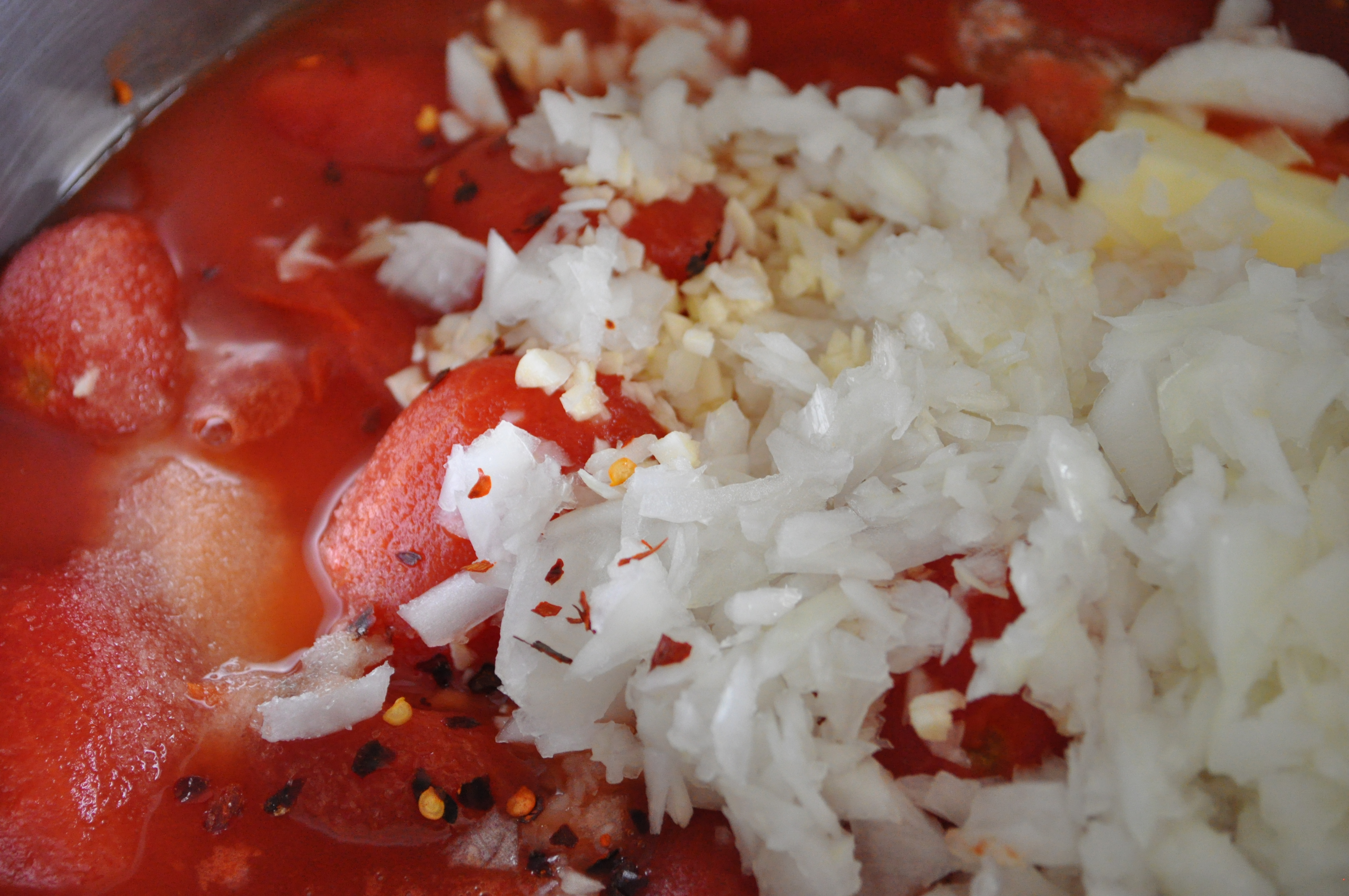 - For sauce: Combine the tomatoes with their juice, butter, onions, garlic, chili flakes and salt in a large pot. I took this picture so there would be photographic evidence that I made something that had chili flakes in it! Anyone who knows me knows my aversion to spicy foods often leads me to omit ingredients like this…I’m trying to branch out. 🙂