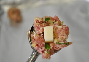 - Use a small ice cream scoop to form each meatball. Push one cube of cheese halfway into the meat mixture, then eject the meatball and mold the ball around the cheese so it is completely enclosed.