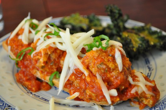 Because I now had much more sauce than I needed, I put 4 cups of it in a tupperware to freeze. I then added the meatballs and hoped for the best! We served them open face (why waste stomach space on too much bread?), on ciabatta buns and I served Kale Chips on the side. The meatballs were DELICIOUS! (Thought I don’t recommend you try today’s cooking methods). They certainly had much richer flavor than my normal recipe and while the garlic flavor was undeniable, it was not overpowering as it had been. Are they worth the extra work and calories? Not all the time but maybe now and then. They were so excellent that I think we’ll have leftovers tonight. That may mostly be due to the fact that I’ll be too busy to cook. My afternoon will be spent shopping for a fire extinguisher.