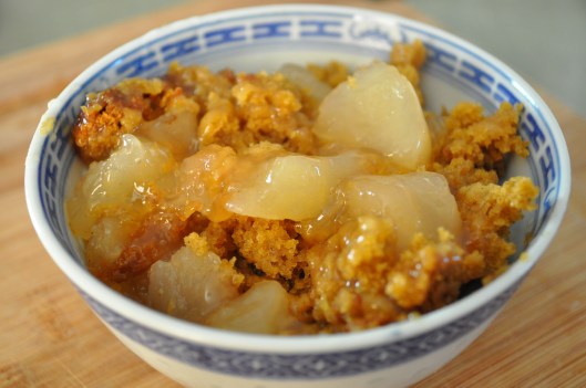 This recipe is not fancy or schmancy. It is just warm, fall, comforting, goodness in a bowl. It has a pumpkin bread topping over apple pie filling. I don’t typically use canned pie filling of any sort. This would probably be very good over some sort of home-made apple filling…but I’m generally making it when I don’t feel like doing much work (like Pajama Day!) or when I have kids helping me cook (students or Trin and her friends) so I’ve never played around with it. I don’t think I ever will, that would be ruining the whole point of it. Easy. Simple. Homey. Yummy.