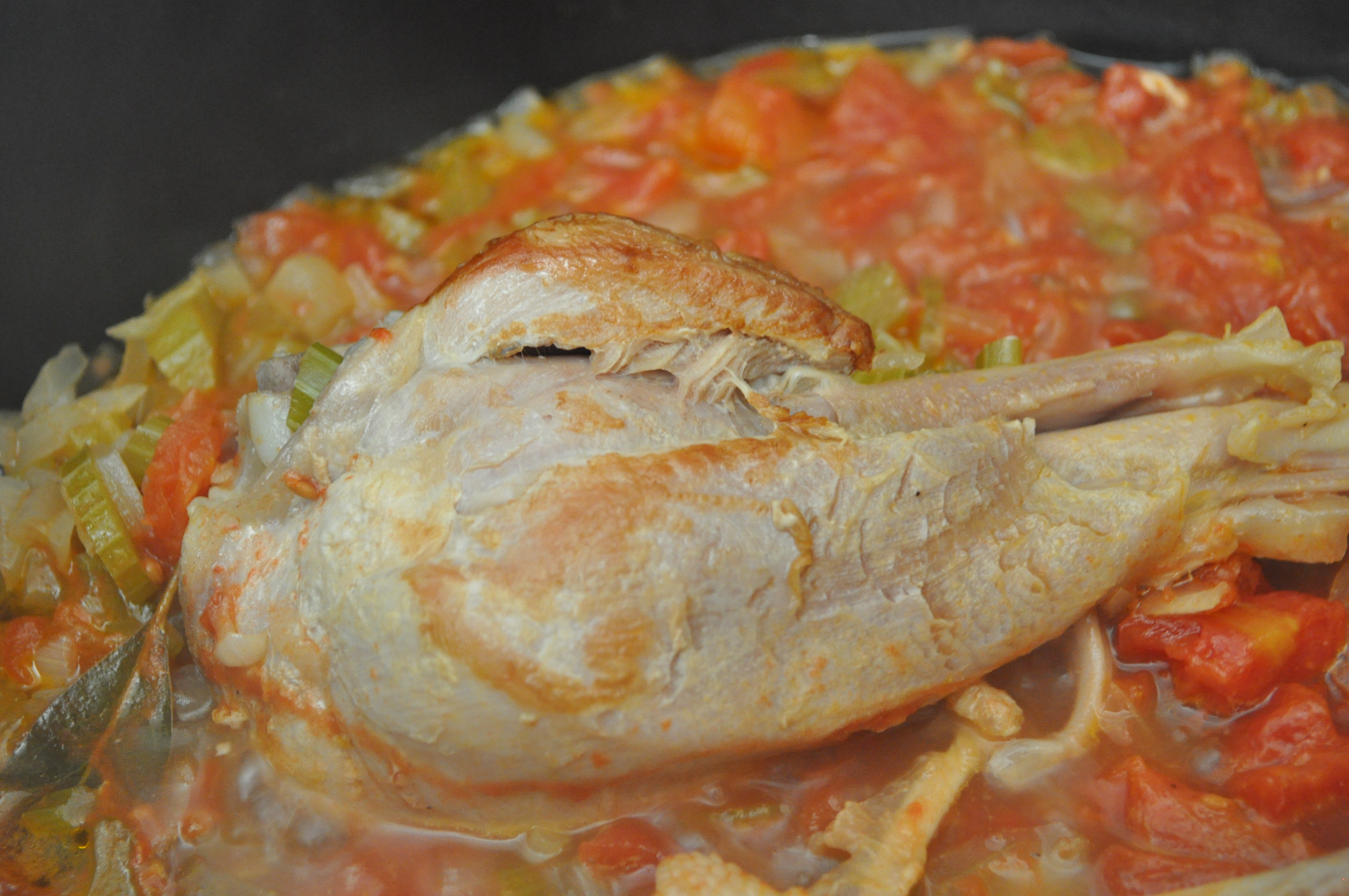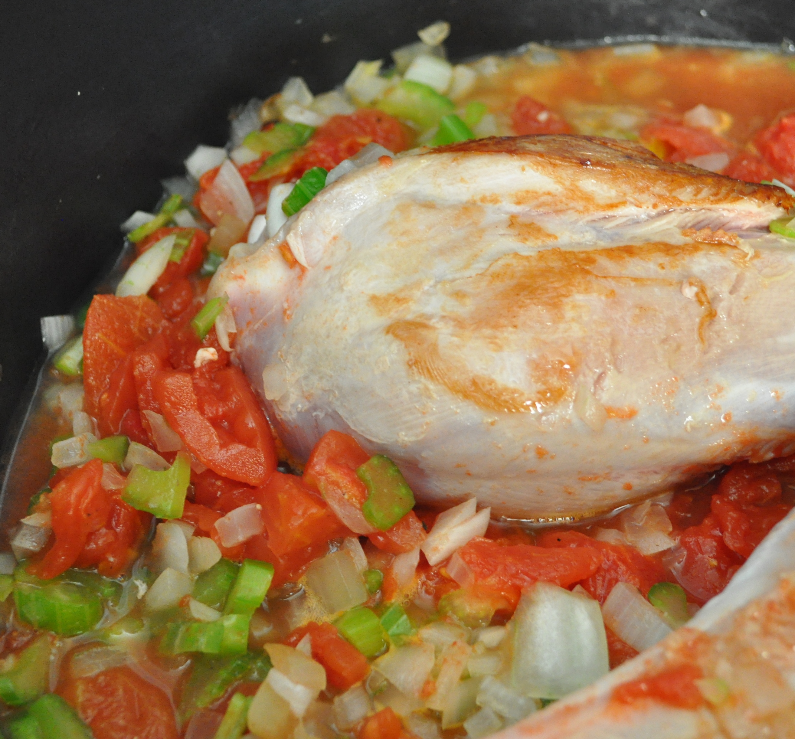 - Add celery, onion, tomatoes with their juice, bay leaf, salt, pepper, and 1/2 cup chicken stock. Since I remove most of the skin from the turkey I make sure it is resting on a “bed” of the veggies to prevent it from sticking to the bottom of the pan as it simmers.
