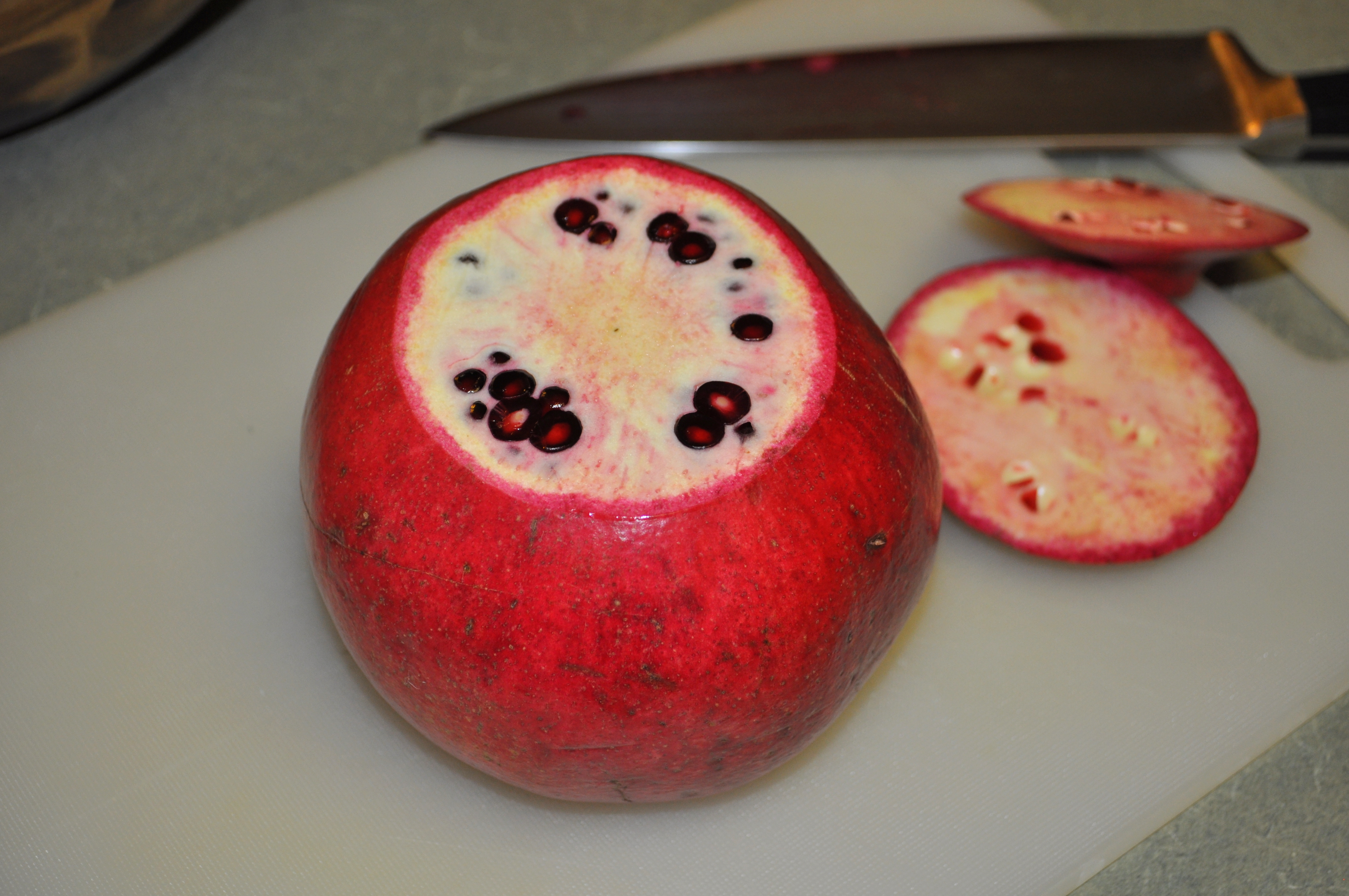 First, cut a small portion off of the top and bottom of the pomegranate: