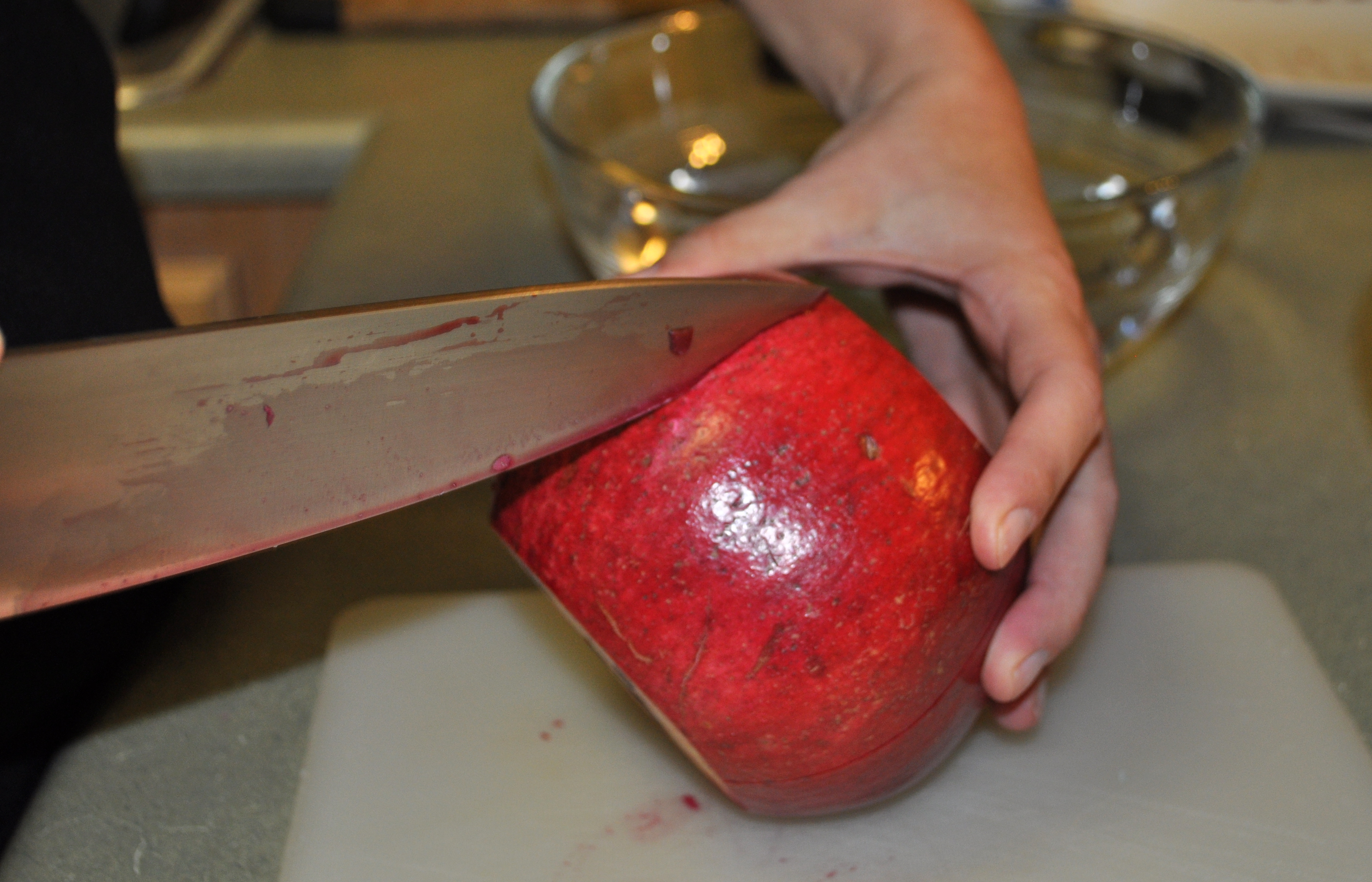 Anyone who is familiar with Alton Brown knows that the man is nothing short of a food genius. He knows everything about everything about food. A few weeks ago I watched a show he did about pomegranates. He offered some very helpful tips on how to get the arils out without looking like you tied dyed your shirt (or your kitchen) when you are done. With six huge, beautiful pomegranates on hand we decided we should familiarize ourselves with his strategies.