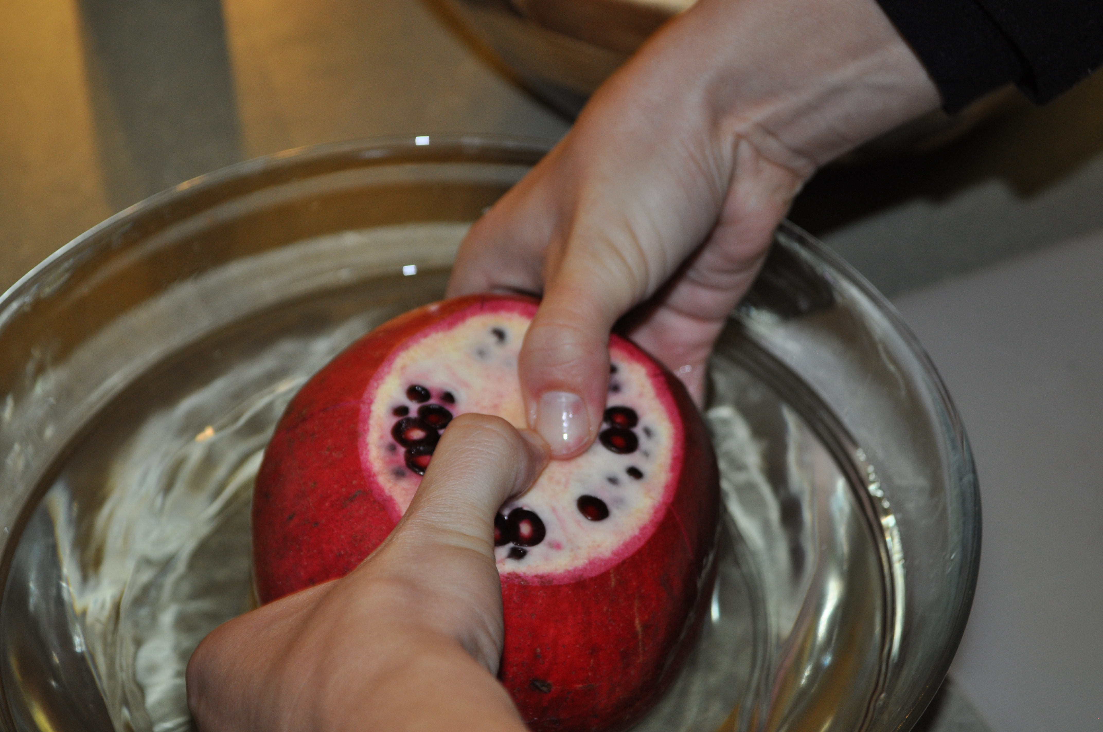 In a large bowl of water. Push in on one end of the pomegranate with your thumbs while pulling apart with your fingers on the other end.