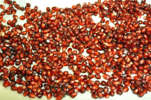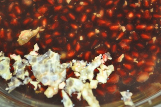 The girls have decided that pomegranates are their new favorite food. Last night Trinity declared “Pomegranate is my true love loves!” Lilly just kept shoving handfuls of arils in her mouth and asking for more. When I tried to get her to say pomegranate she replied “kah-kah!” So….add that one to the Linglish-English Homonym list as the 3rd (4th?) meaning for “kah-kah.” I made another fun pomegranate recipe last night (a middle eastern dish!) but thought that before I post that recipe I would document the de-ariling (yes, I think I just invented a word) process.