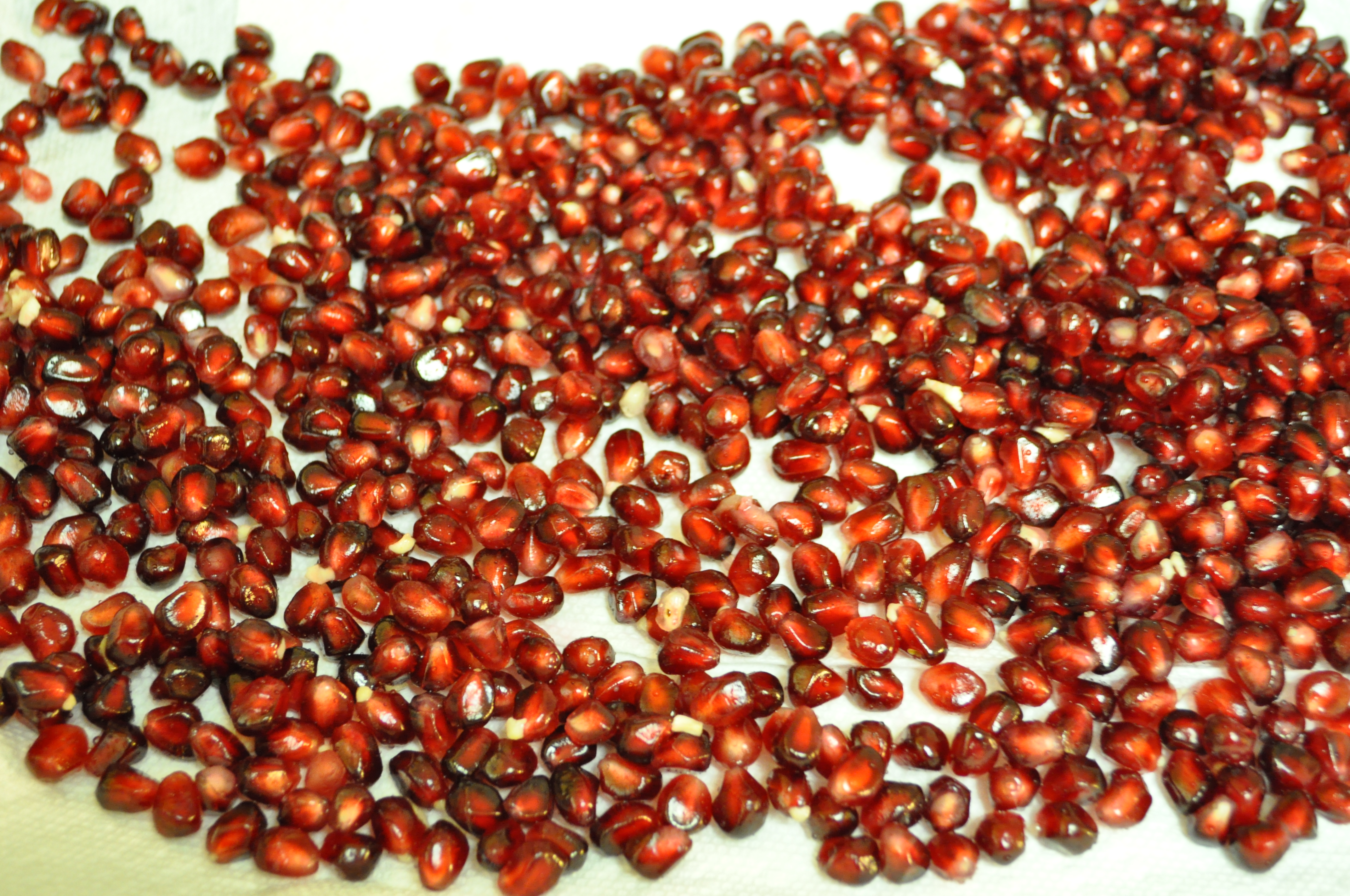 Skim the pith off the top of the water and discard. Pour the arils into strainer. Place some paper towels on a pan and spread the drained arils out to dry: