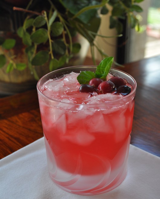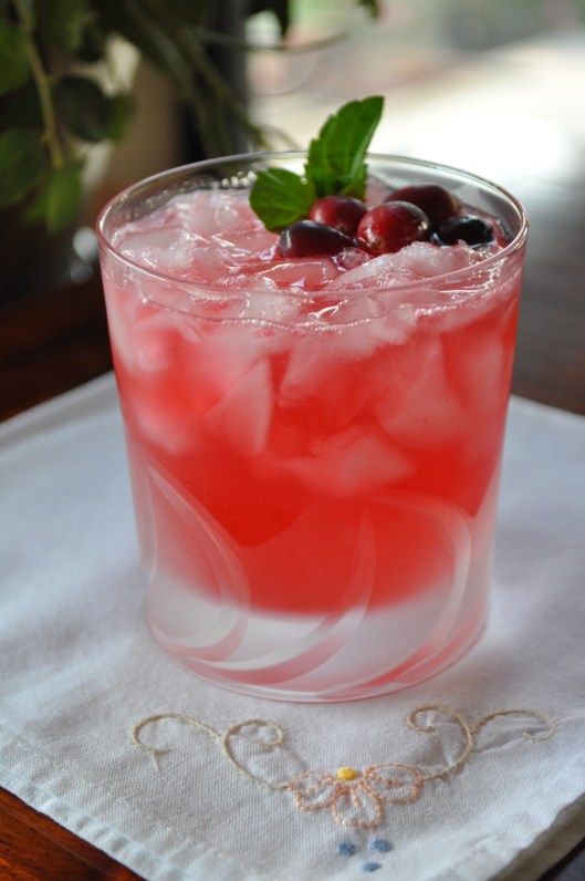 Fill a lowball glass with ice. Strain the contents of the cocktail shaker into the glass and top with the Club Soda. If desired, garnish with fresh cranberries and a sprig of mint. If you like your drink a little sweeter you can add more of the cranberry syrup, 1/2 ounce of Triple Sec, or squeeze the juice from an orange wedge into it.Β