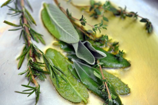 Pour 1/4 cup olive oil in a large saucepan. Add the sage, rosemary and thyme and warm the oil over medium heat to infuse it with the flavor of the herbs, 3 to 4 minutes.