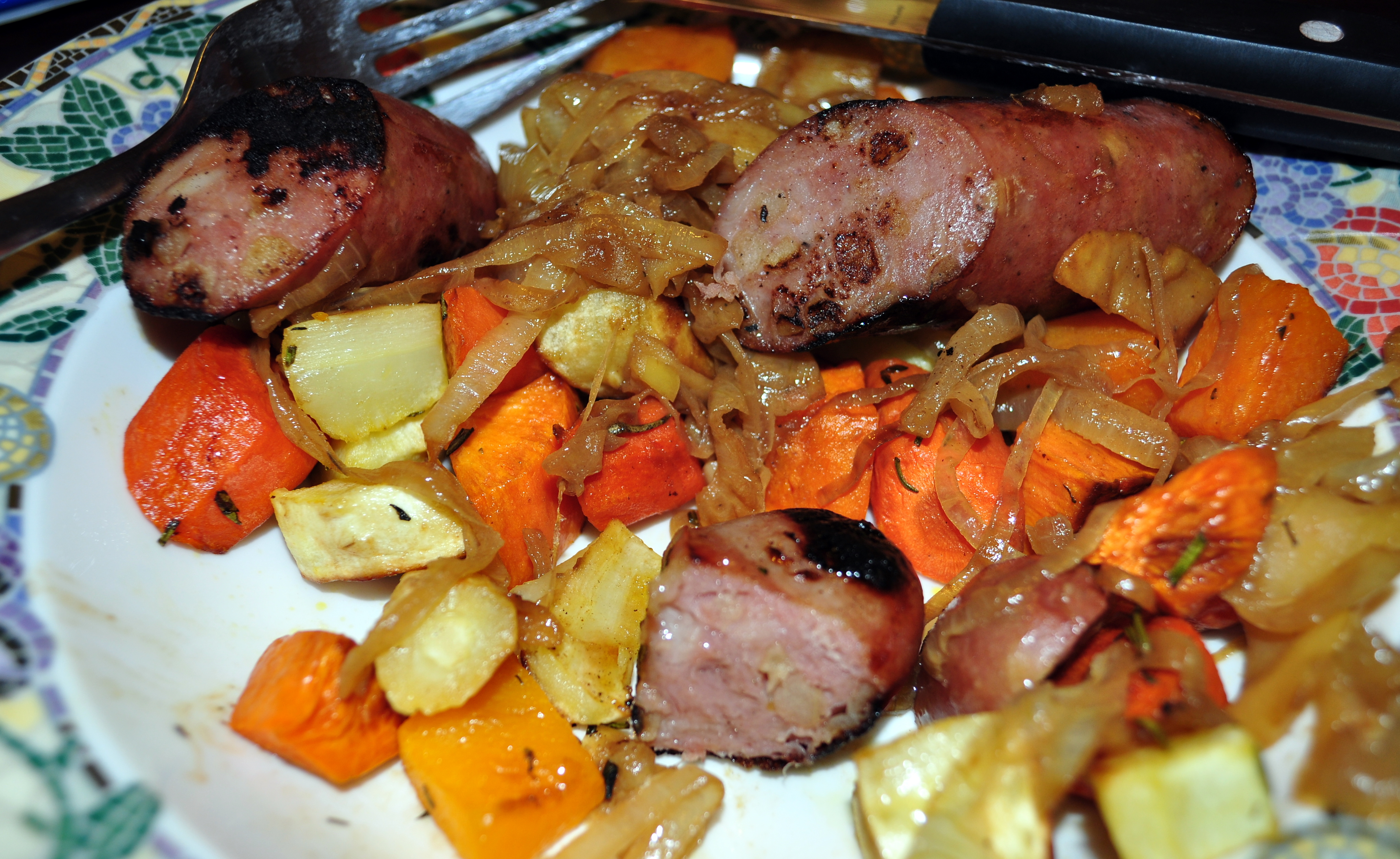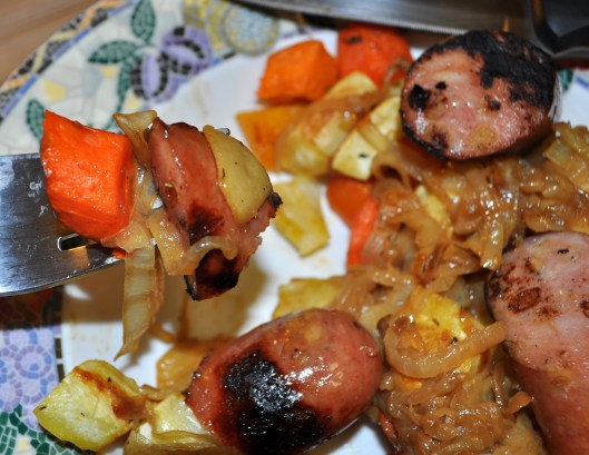 If you didn’t catch it from the title, the name of this dish is a play off of the infamous British Bangers and Mash. It came about from a refusal to go grocery shopping. A few weeks ago, as we prepared to leave for Colorado I was trying to use up whatever I had left in my refrigerator. I was shooting for something at least edible to feed the family and what I got was a recipe I will definitely make again. I decided I would wing it and make a mish-mash of whatever I had on hand. That turned out to be: All natural chicken and apple sausage cooked until crispy on the outside, nestled into a bed of roasted root vegetables and carmelized onions and apples that were deglazed with dark beer. It is practically guilt-free comfort food perfect for a cold night. (What?! Don’t roll your eyes…The sausages are all natural… Obviously that’s code for “total health food.”)