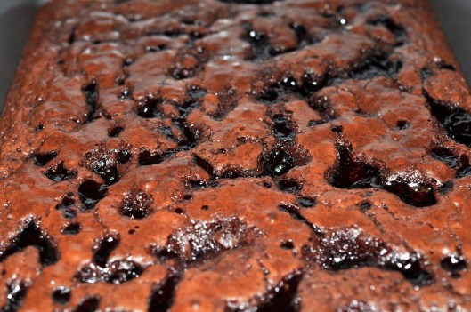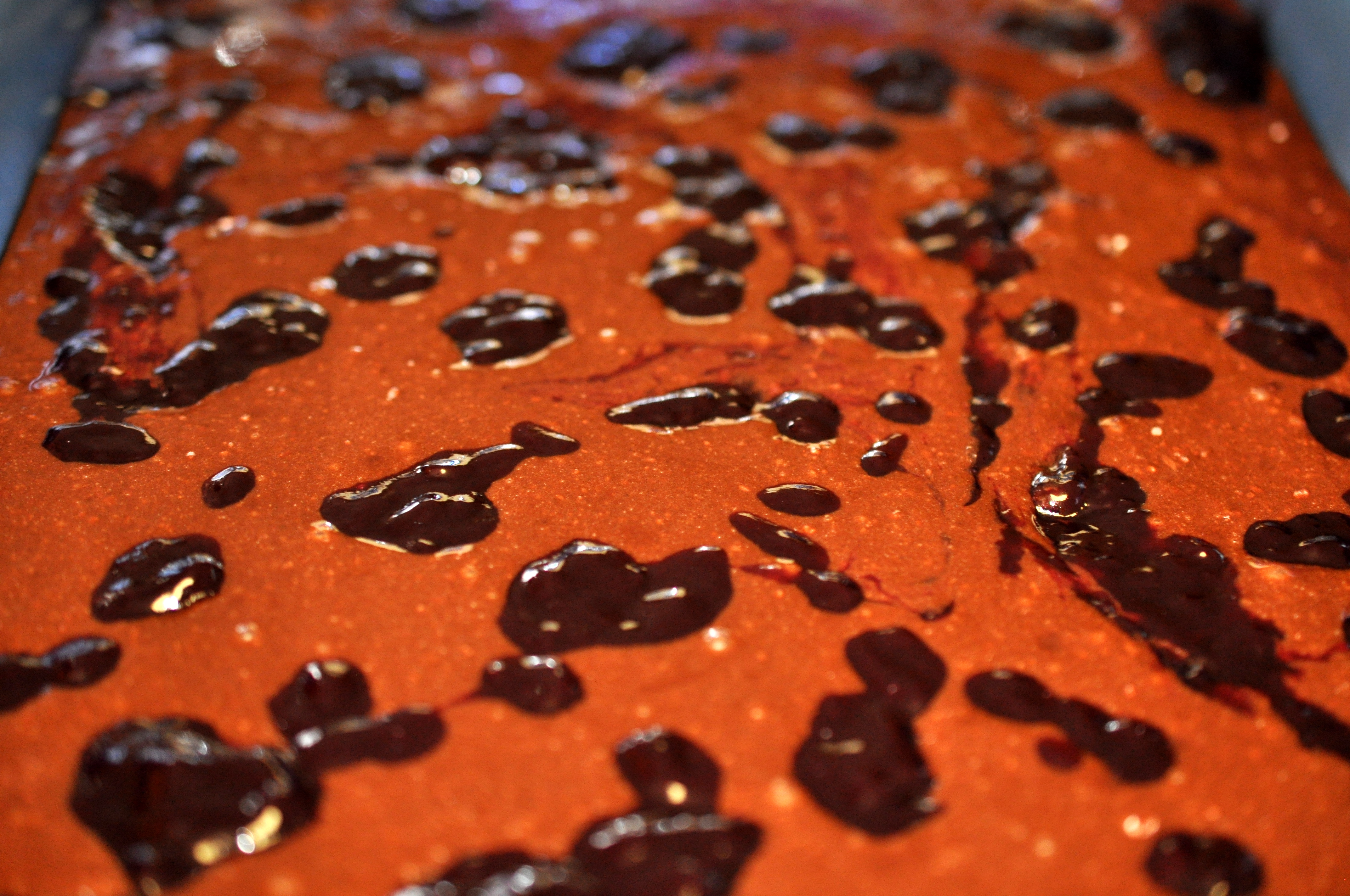 Mix all other ingredients together in a large mixing bowl. Pour into a greased 9×13 pan. Drizzle the jam by spoonfull over the brownie mix.