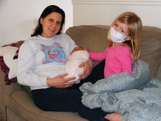 • First off, I found myself looking like this after Lilly was born. I HATE this photo! I almost can’t believe I’m posting it on the internet, but it was my motivation to start running. (Trinity was getting over being sick when we brought Lilly home so she had to wear the surgical mask around her!)