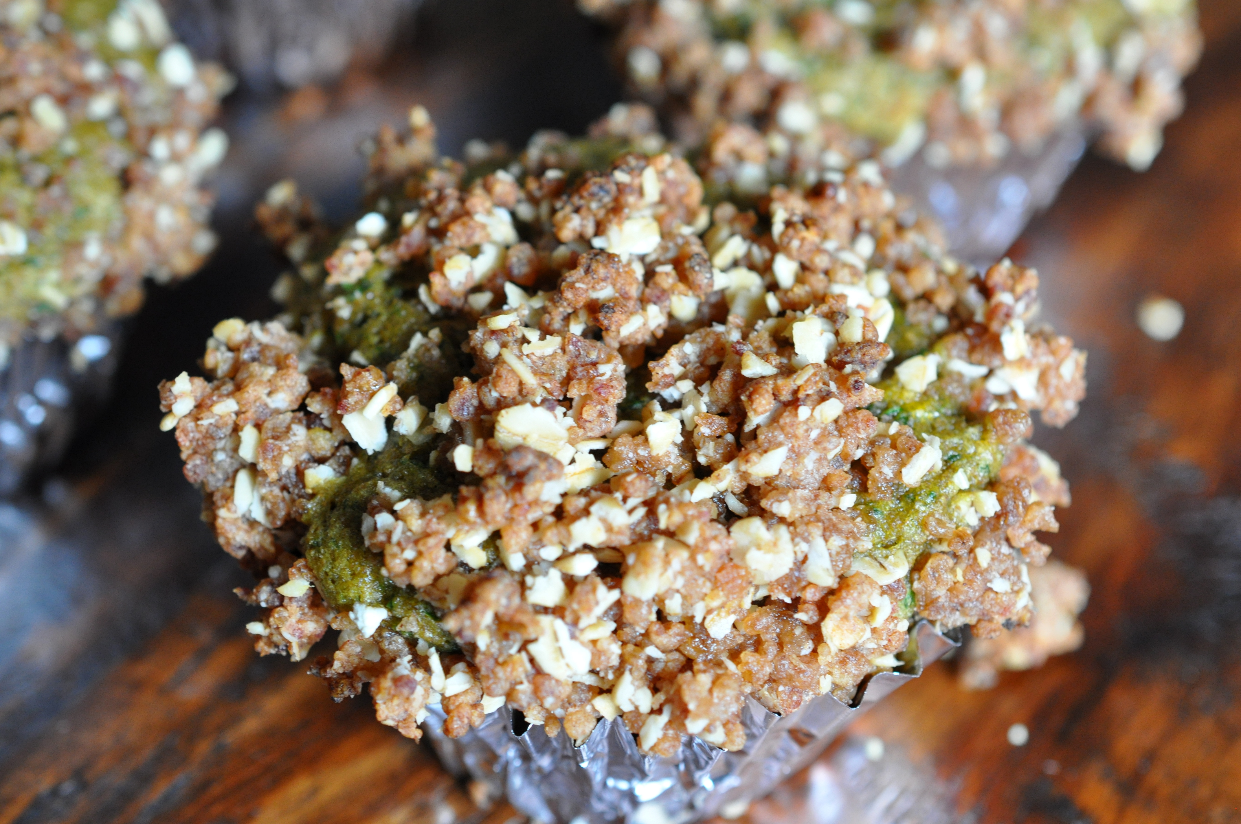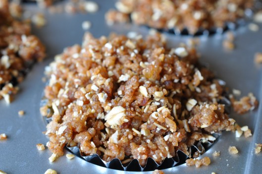 Place dates in the food processor and pulse until finely chopped. Add oats, flour, coconut oil, honey, cinnamon, and nutmeg and pulse until combined and crumbly. Divide mixture over the top of the muffins. I did not quite use all of it.