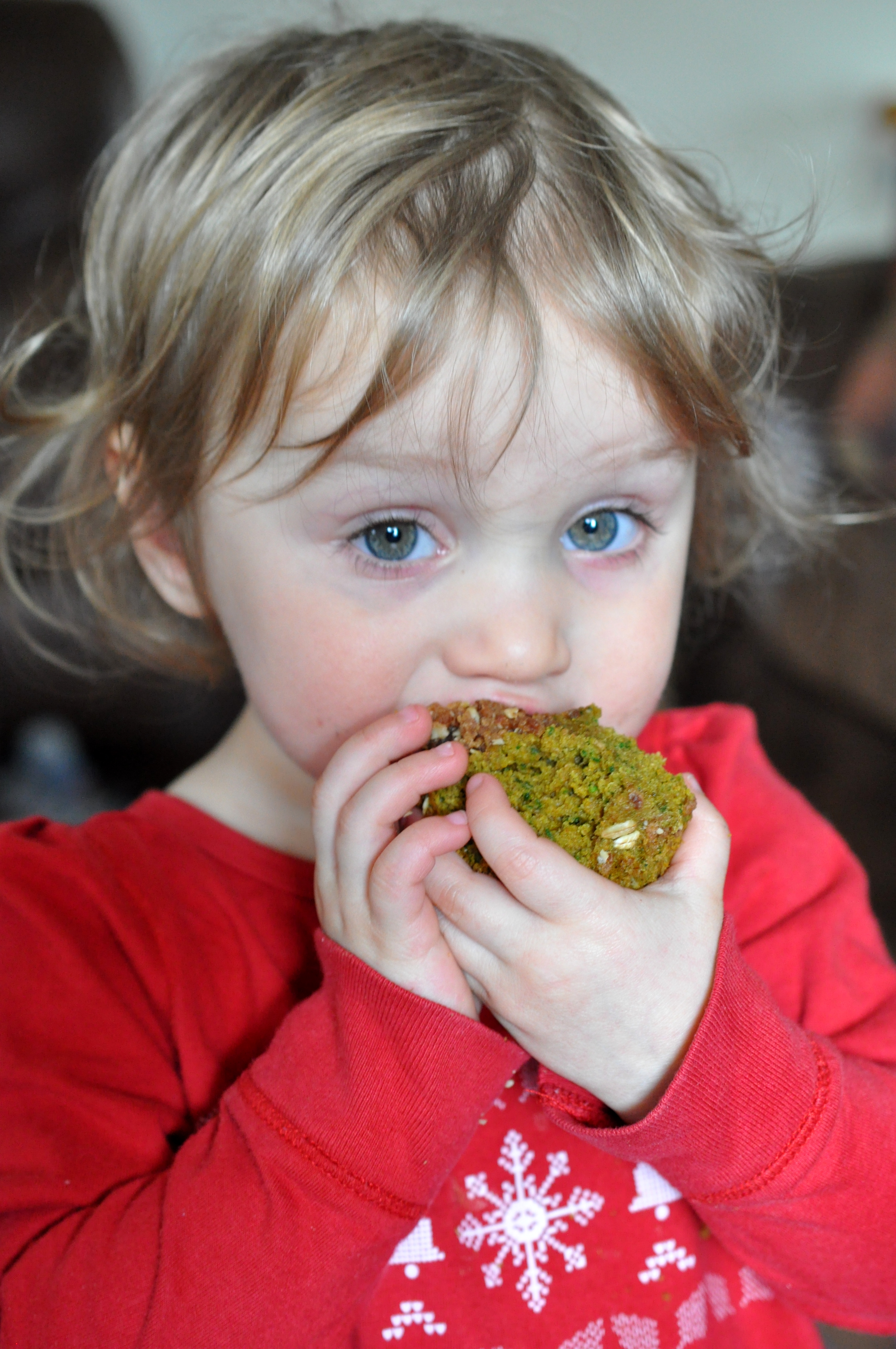 Moist and flavorful, they don’t taste of spinach at all but it does add iron, calcium, and vitamin C! The pumpkin means these are chock full of Vitamin A, and the Banana and dates pack a punch of potassium. (Say that 10 times fast!) They also have 5.7 grams of fiber. But if you don’t tell, no one will know. Lilly followed me around pronouncing them “CAKE!” and gobbled down every last bite of her “treat” saying “MMMM…TREE!!!” inbetween every few bites. (And she’s my harshest critic, believe me!) Today’s personal challenge: Make sure there are some left for Andy and Trinity to try when they get home. Success is not altogether certain.
