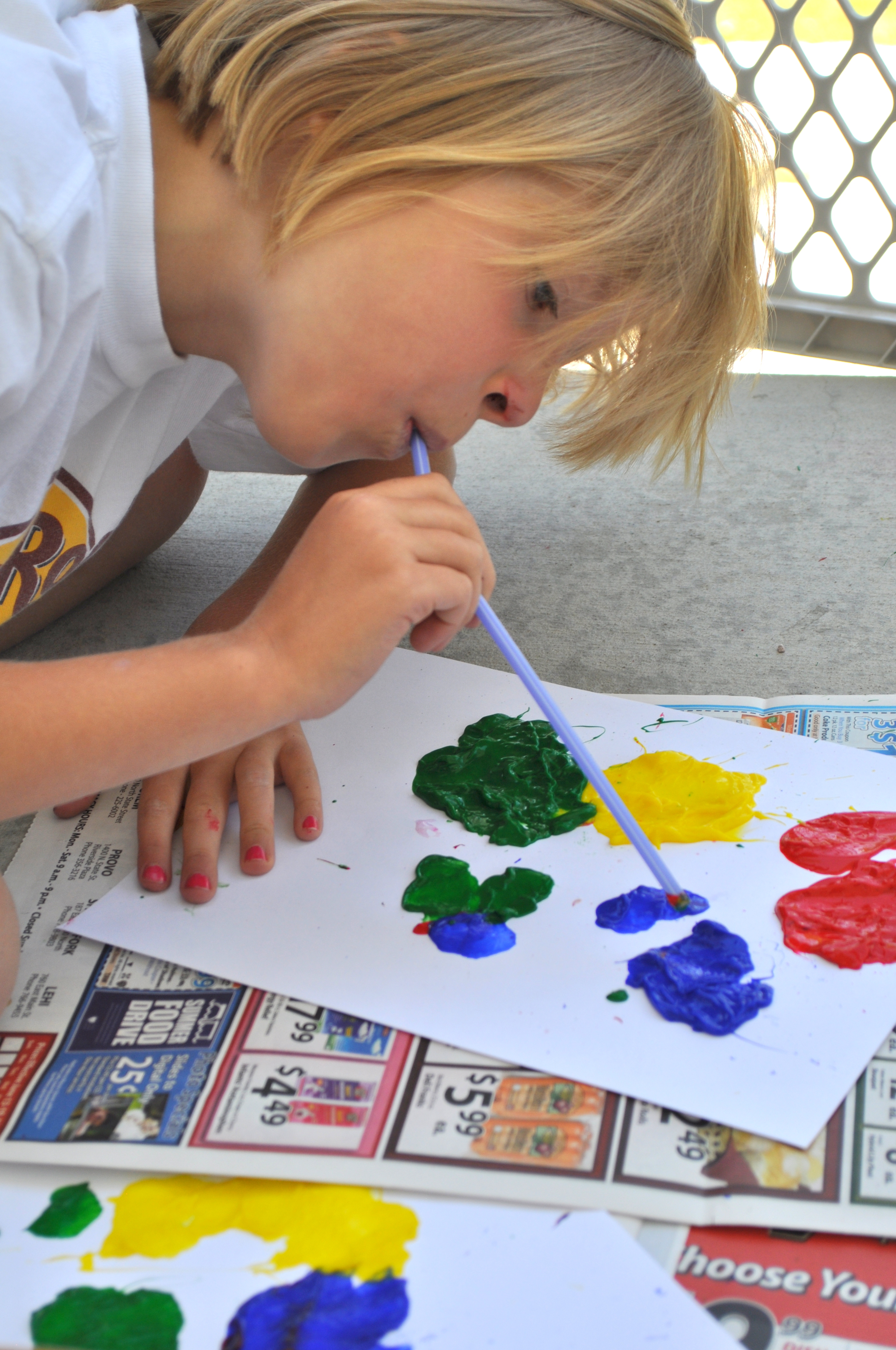 The poor kid seemed like she could use a fun Fancy Pants Tuesday. There’s only so many times you can paint your nails or make cookies before you’re looking for a little diversity. Luckily for my little swollen-nosed champ, I already had plans to pick up some craft supplies. I’m not the biggest fan of crafts. They are generally messy and FAR more work for me than the girls. However, in the interest of branching out, and doing things I know she enjoys, I herded Trin outside during Lilly’s nap and we spent some time making artwork with paint and straws. She loved the novelty of a new way of painting and I loved the simplicity of it: