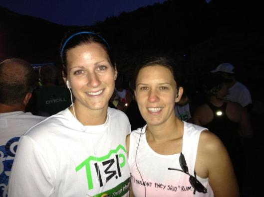 Instead we enjoyed it by starlight in the predawn hours, doing a little yoga, having a pre-race snack, and making small talk to calm my jitters. Here Jenny and I finally line up at the starting line for our 6AM start: