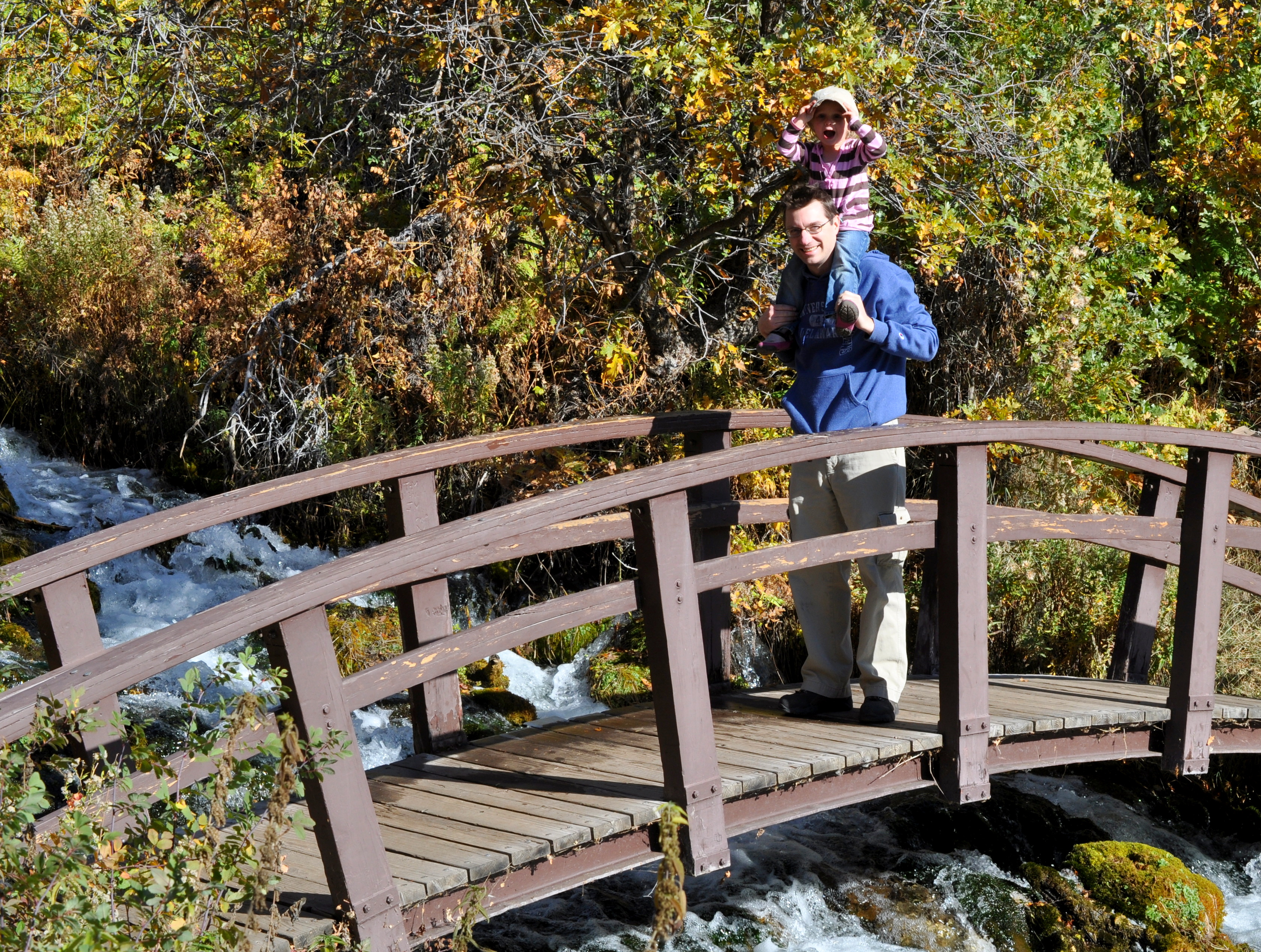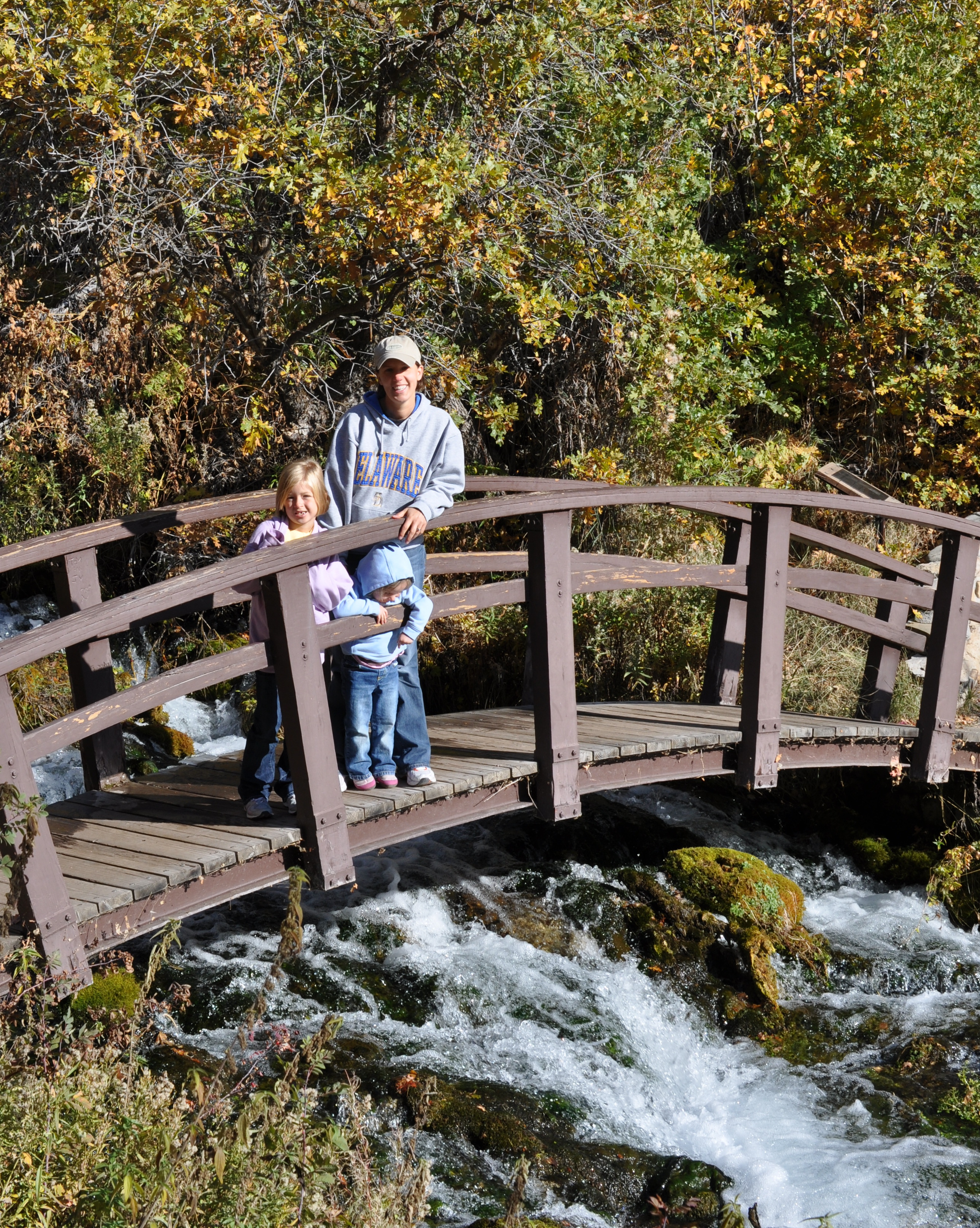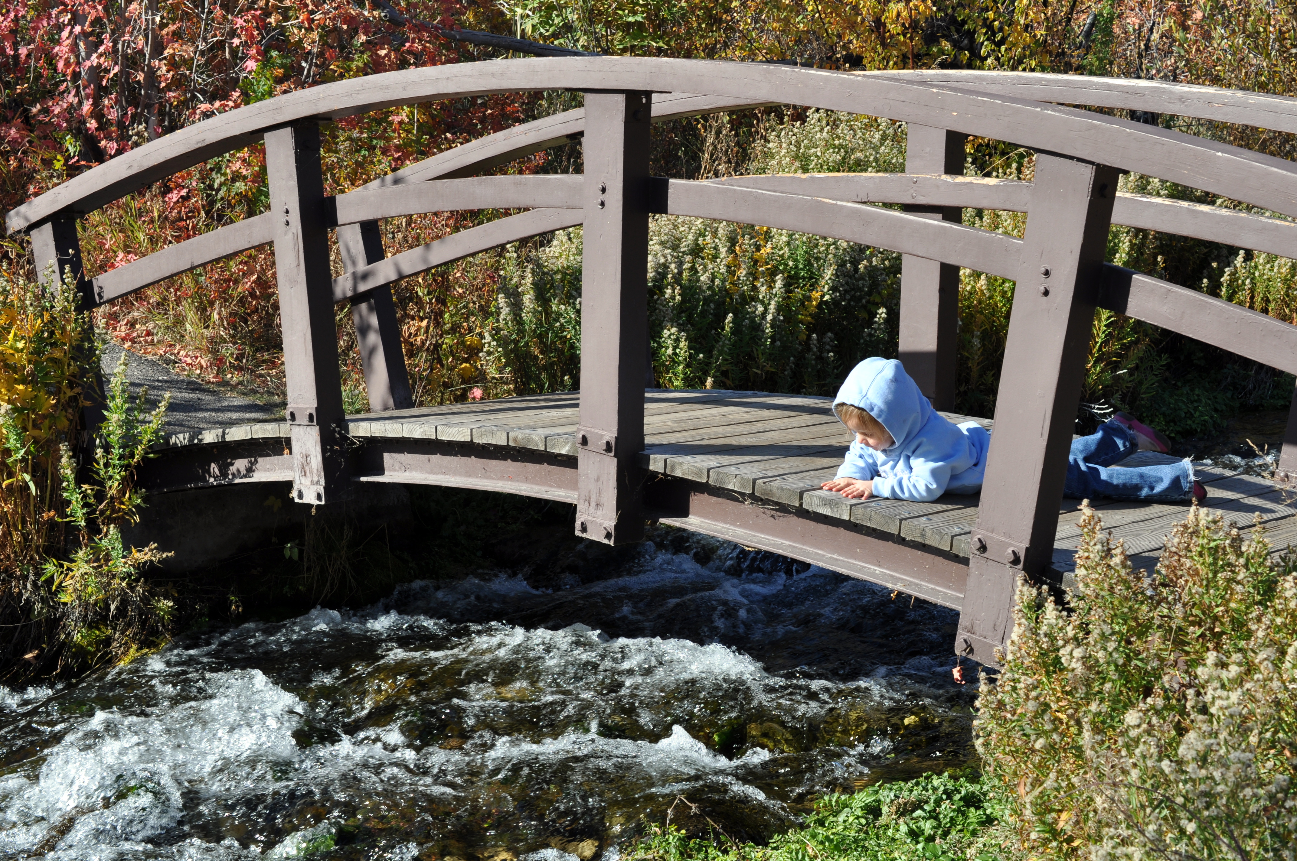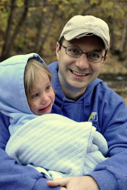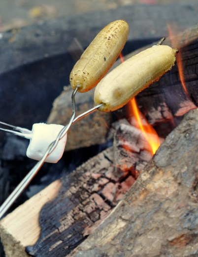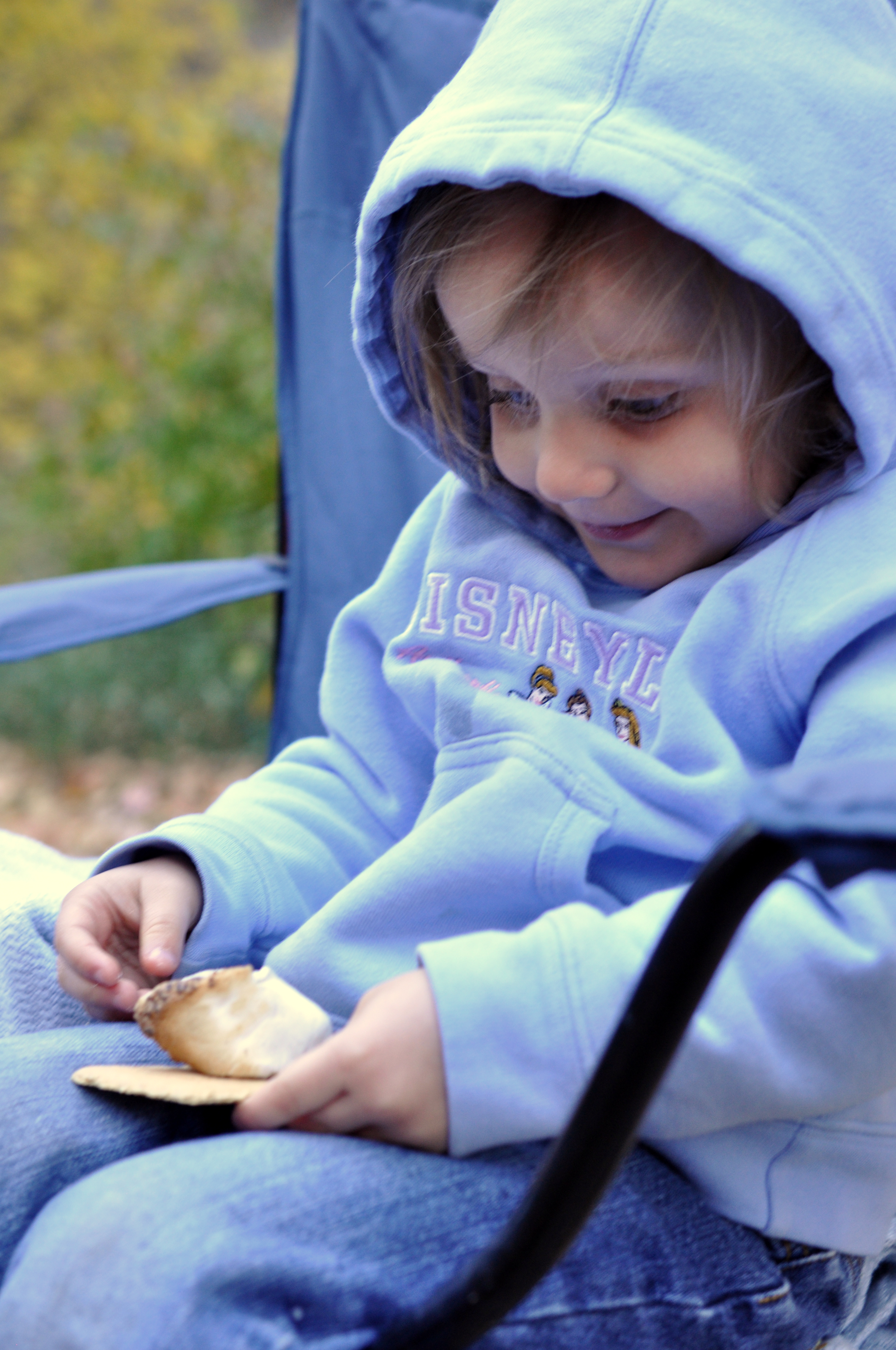 This next picture is one of great life importance to Trinity so I had to capture the moment. Andy is imparting the wisdom of how to make a perfectly roasted marshmallow. And yes, her sweatshirt is on backwards. She decided it is cool to wear it that way. 🙂 :Is there anything quite like the anticipation of something so wonderful as a freshly roasted marshmallow? We put them on graham crackers…no chocolate, because that would just be crazy for breakfast! 🙂Her first taste was rather delicate:Trin, however, dove right in:Do you know what is totally amazingly delicious?! Roasted baby bananas!! Andy roasted them until they were all  bubbly on the outside from the sugars of the bananas caramelizing. Here they are in progress. They were so yummy, they deserved a photo slot of their own:When we decided it was time to pack up…and by that, I mean that the food was eaten, and Lilly – who was too scared of the fire to get close to it to warm up – decided she was tired of being cold:…we headed up to Cascade Springs: