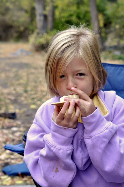 We were supposed to have had a campfire dinner the night before, cooking hot dogs and marshmallows, but Andy’s flight home from a business trip had been delayed. This meant he got home too late for our planned family adventure. As I sat in front of a campfire silly early in the morning, next to a river, amid fall colors, licking sticky marshmallow from my lips…for breakfast (!), I thought to myself…”This is even better! I love my life!”