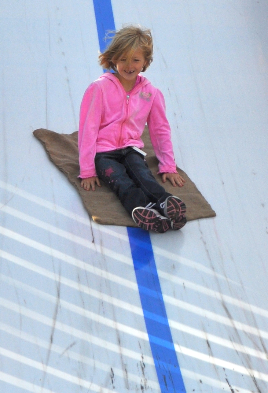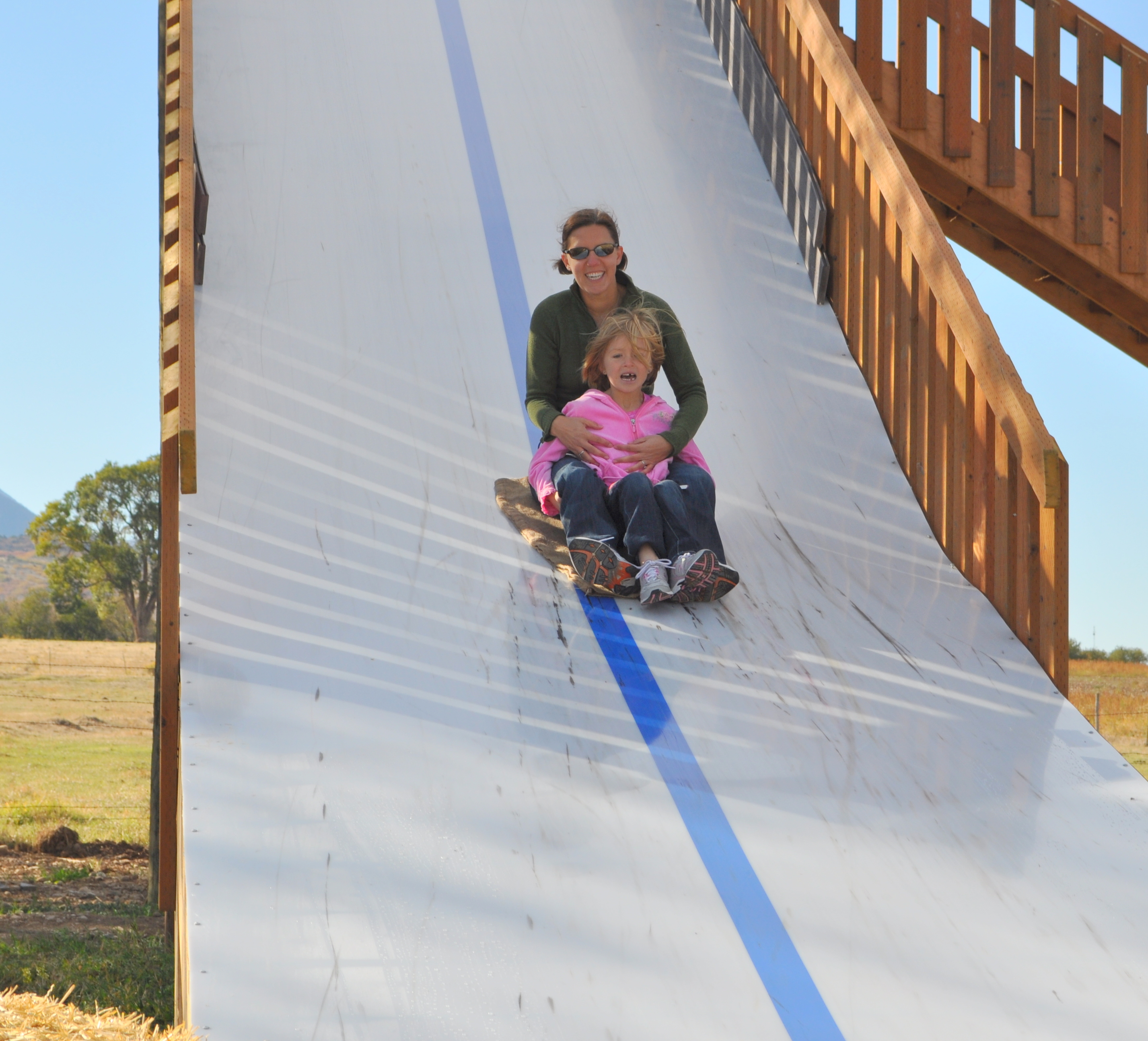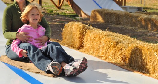 The very nice gentleman explained that, while their pumpkin patch is normally something they only offer in the afternoons, they had a field trip arriving any moment and we were welcome to tag along. There is a hayride to a choose-your-own-pumpkin field, a maze made of stacked apple crates, a large slide and play area. Pumpkins honing in on apple day? Who cares? It sounded like fun! They didn’t even charge us for it!