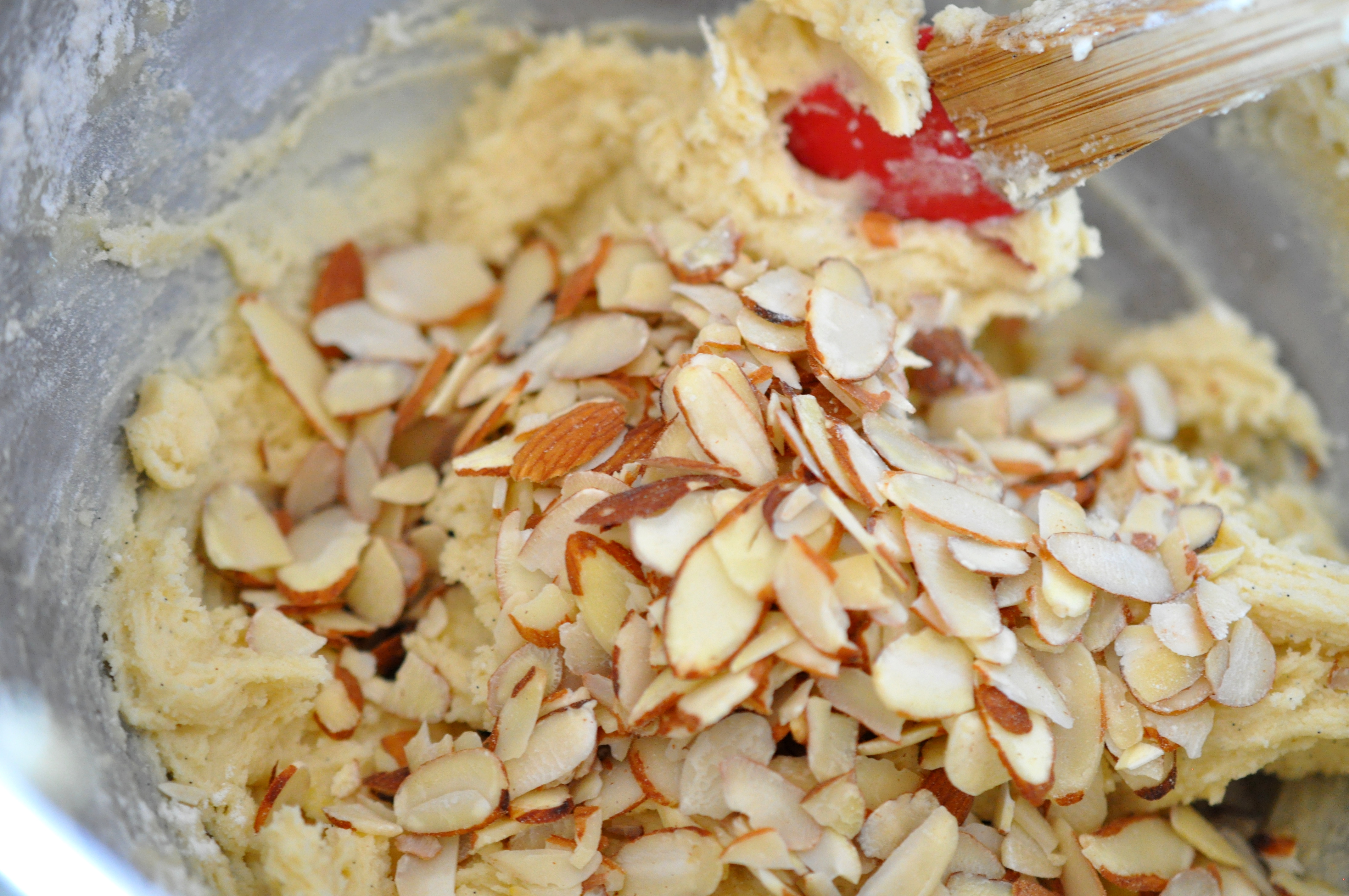 Stir in flour mixture until just combined. Stir in almonds by hand.