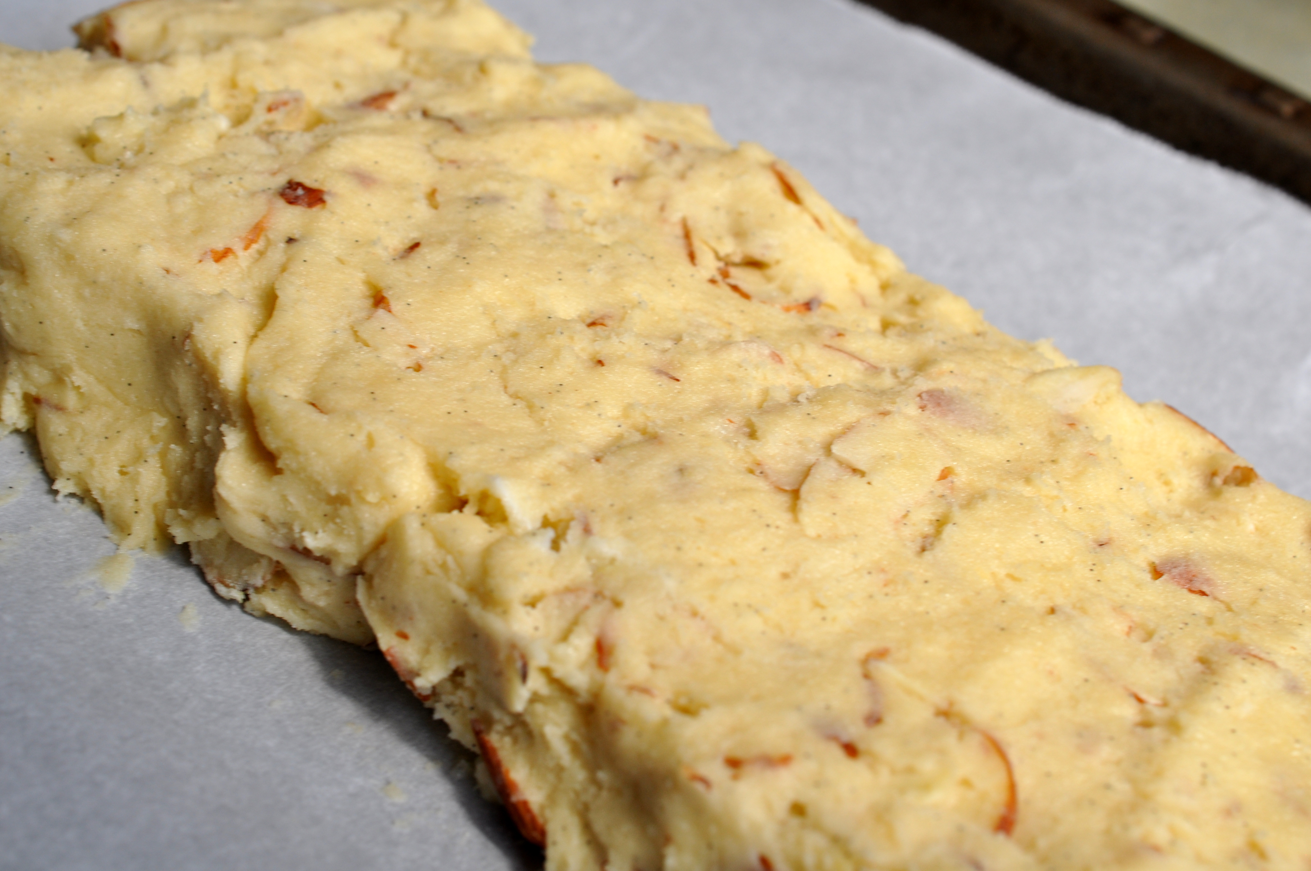 I referenced a Giada De Laurentiis biscotti recipe for dry to wet ingredient ratios and made the rest up. I wanted to go with ingredients that A) I love and B) I had on hand. Vanilla beans and almonds were what I came up with. 🙂