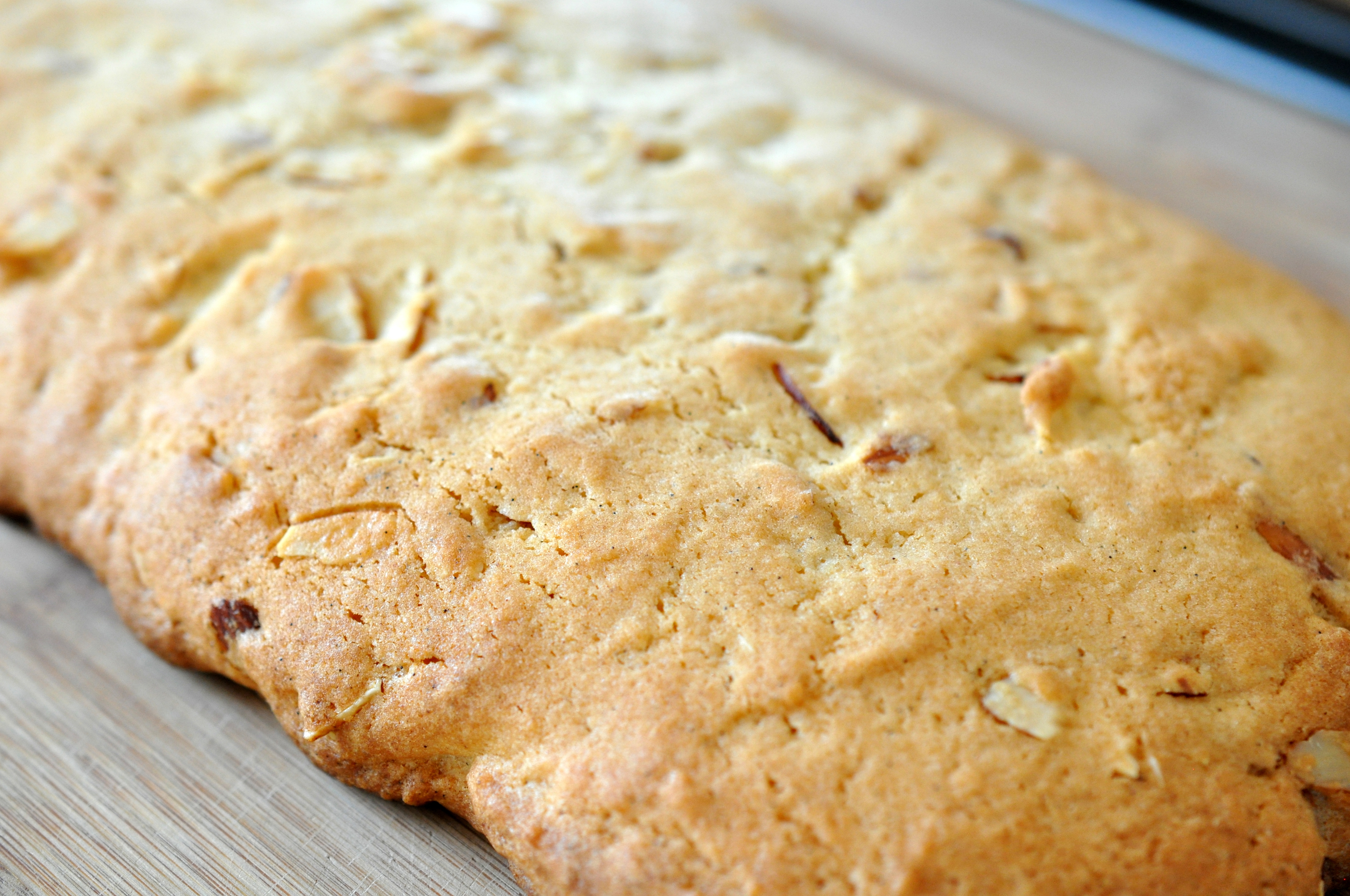 Carefully remove biscotti to a cutting board. Use a serrated bread knife to slice the loaf into 1/2 to 3/4 inch thick slices, on a diagonal. Aside from the end pieces, this yielded 12 slices. Lay each slice, cut side down back on the parchment paper. Bake for 10-12 more minutes. I bake for five minutes, carefully flip the cookies over and bake for 5 more minutes. Cool completely and serve.