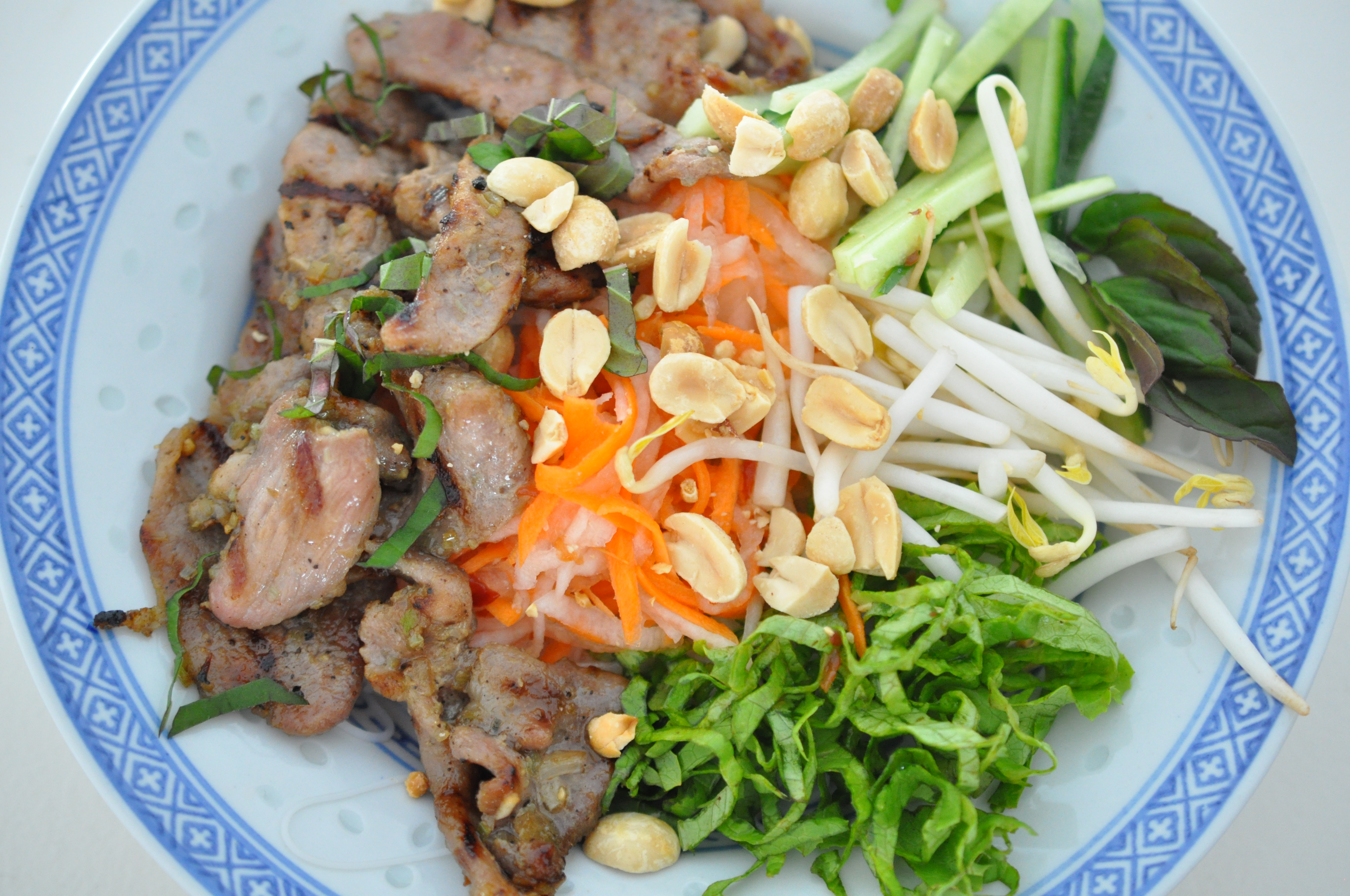 My favorite Vietnamese meal, Bun Thit Nuong, is a hearty bowl of barbecued sweet pork served over rice noodles, with cucumber, fresh mint, pickled carrots and daikon, beans sprouts, peanuts, thinly sliced lettuce, and nuoc mam cham. It balances sweet, salty, tangy, crunchy and soft tastes and textures. It is seriously delicious!