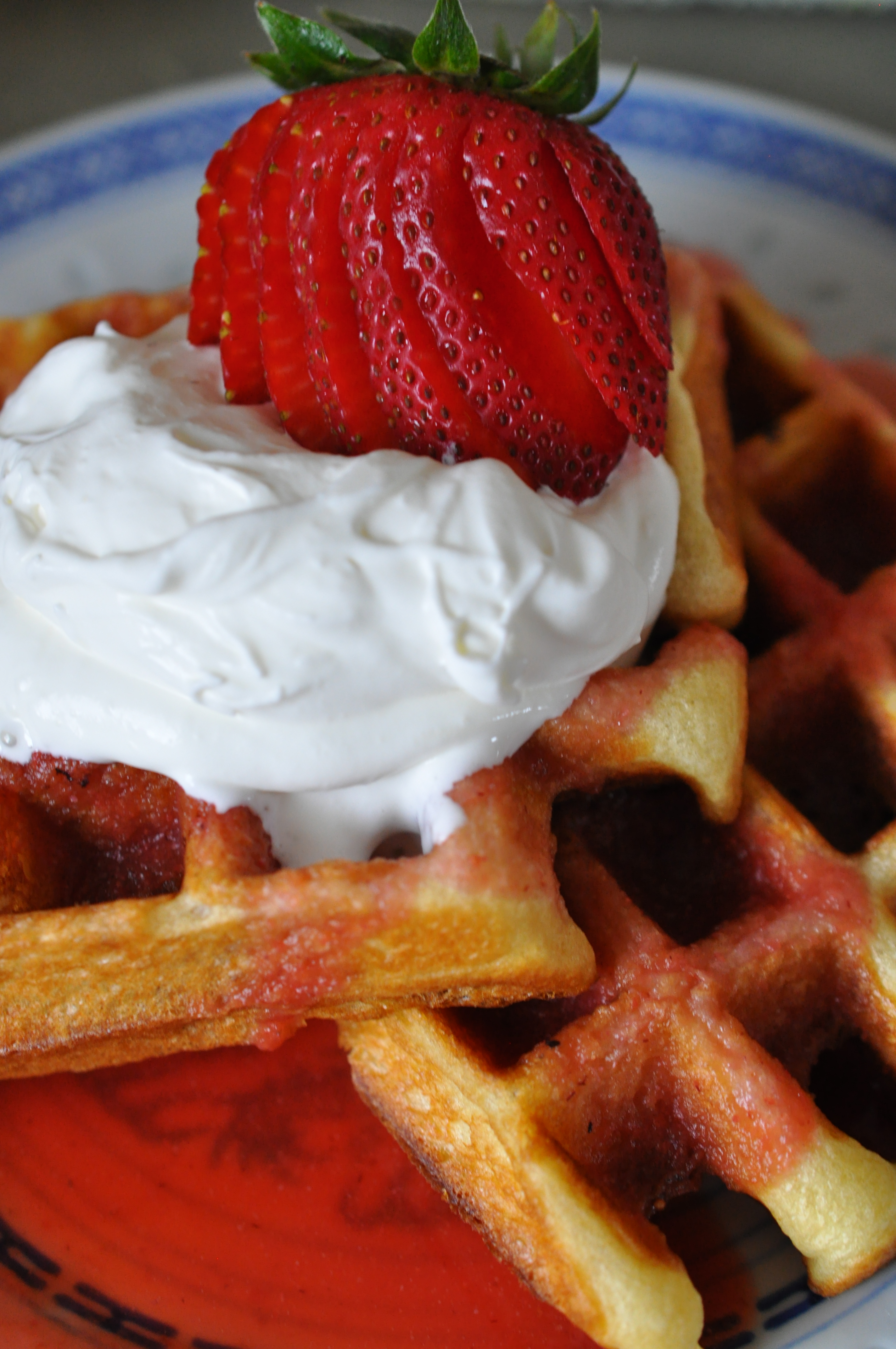 Pour waffle batter into your waffle iron and drizzle strawberry preserves on top before closing. (At first I drizzled the preserves directly into the batter, then poured into the waffle iron but adding it later ensures that each waffle has some strawberry preserves throughout.) My waffle iron makes 4 waffles at a time. I poured in half of the necessary amount of batter, drizzled about a tablespoon of preserves over each waffle then poured the rest of the batter on top before closing the waffle iron.
