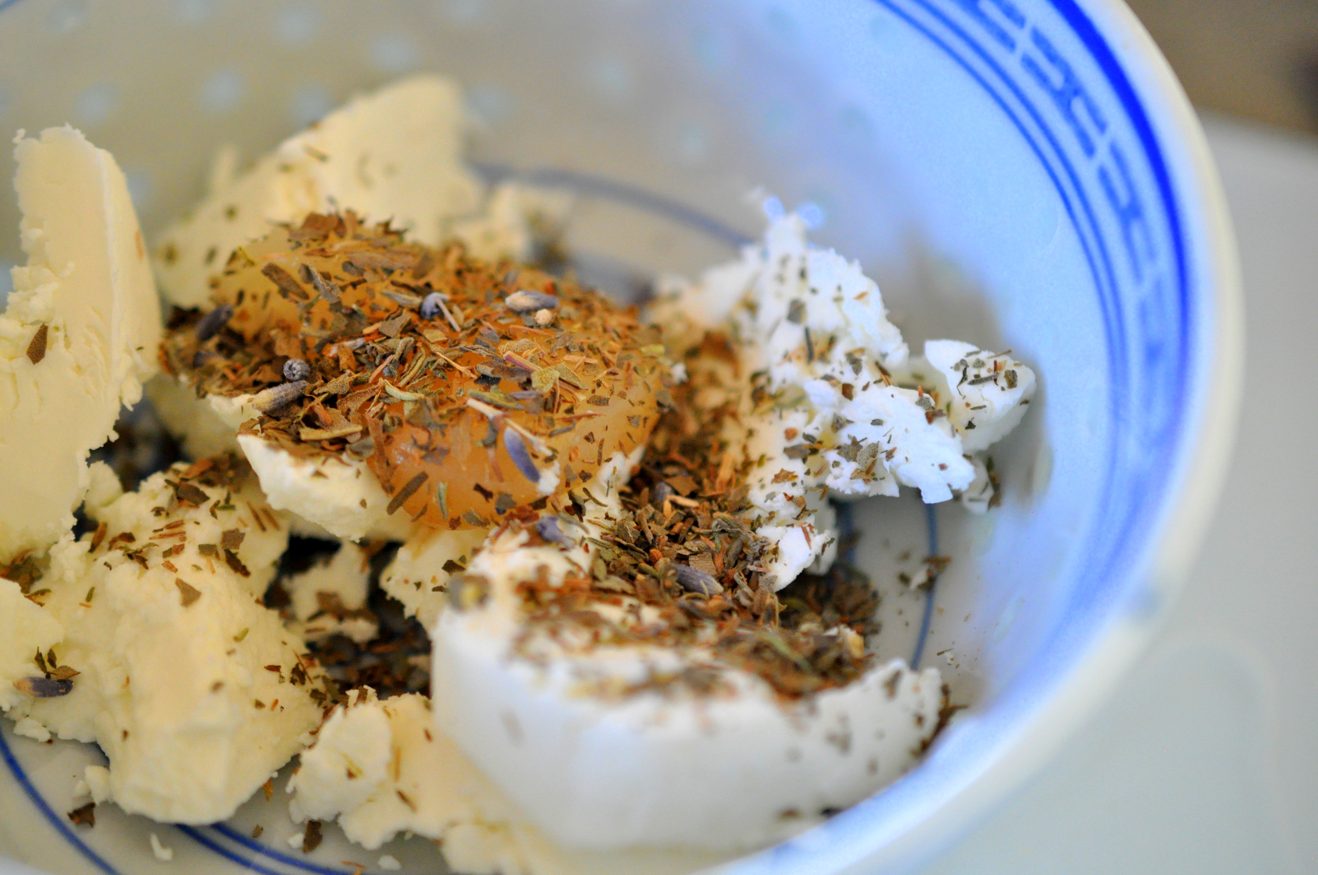 In a small bowl, combine the goat cheese, Herbs de Provence, and raw honey:DSC_0349