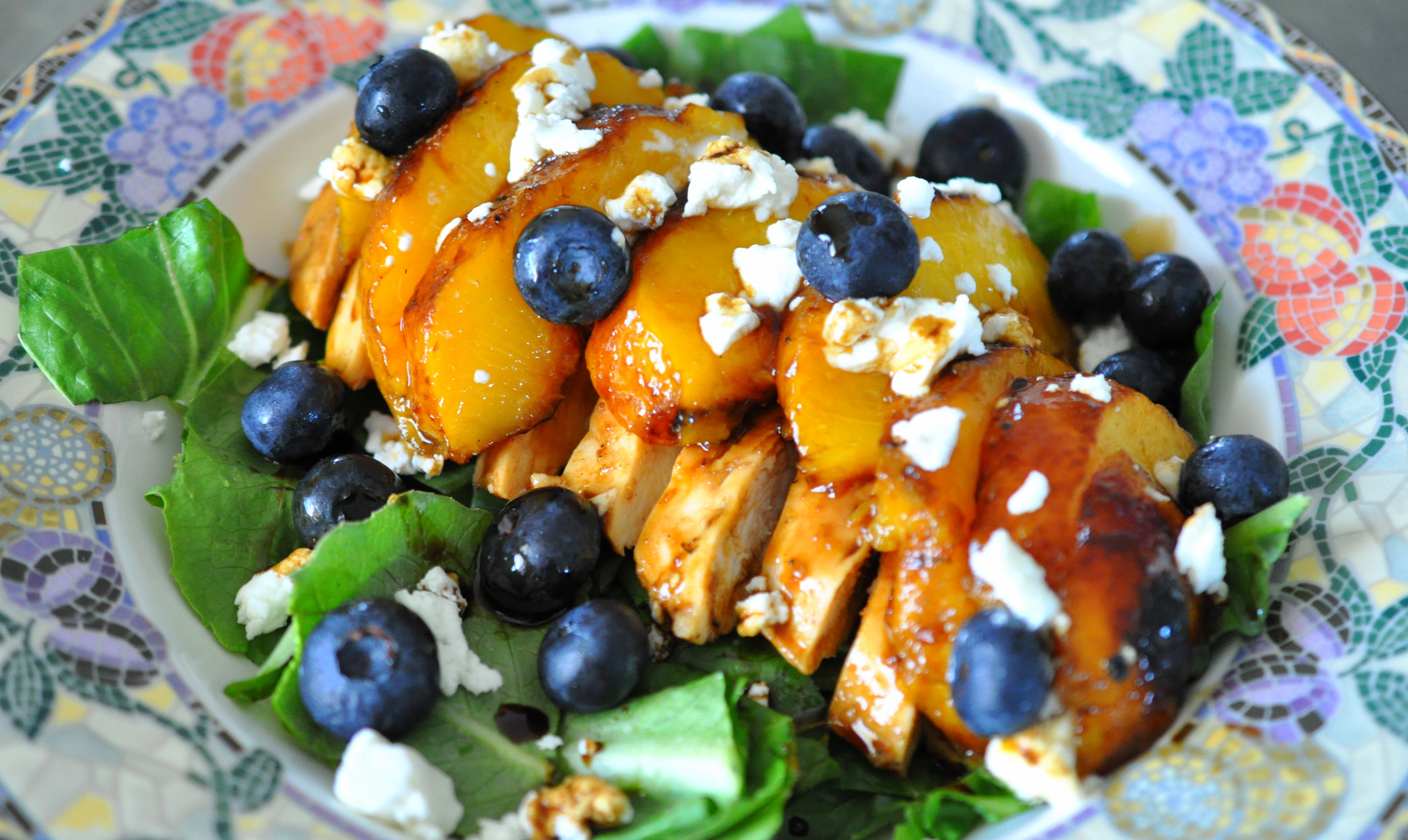 balsamic vinegar, easy cooking, entertaining, entree salad, goat cheese, Grilled Chicken, Grilling, molasses, peach salad, peaches, salad, skinless chicken breasts, summer cooking