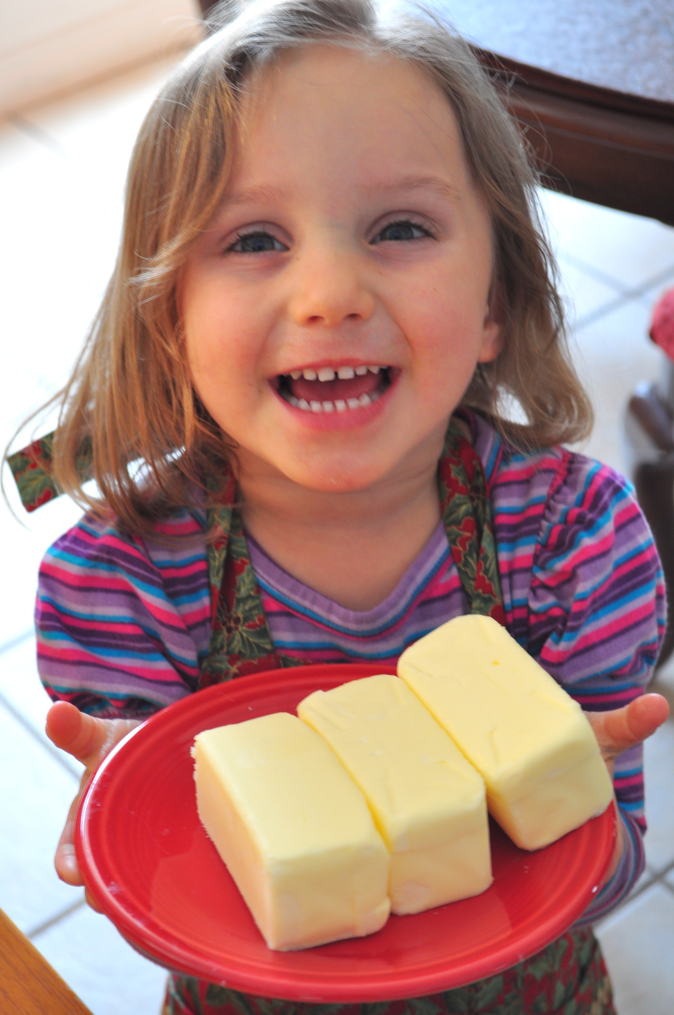 If, like me, you did not leave your butter out all morning to soften, microwave it for a few seconds to soften. I had a little help unwrapping the butter: