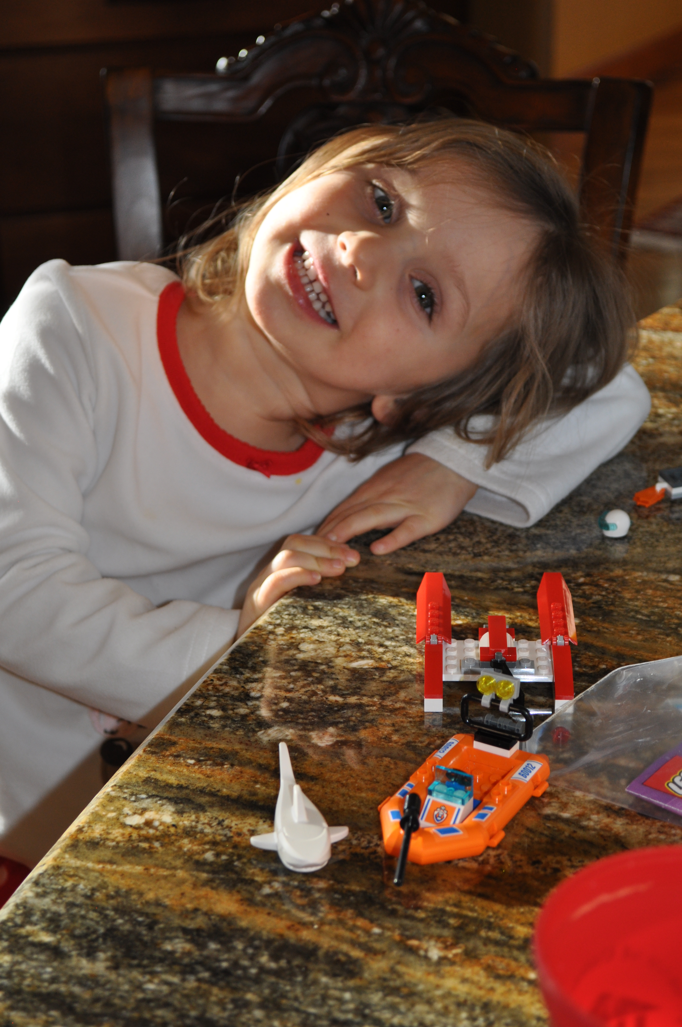 Lilly with her Coast Guard Legos (Yup! Complete with a shark!):