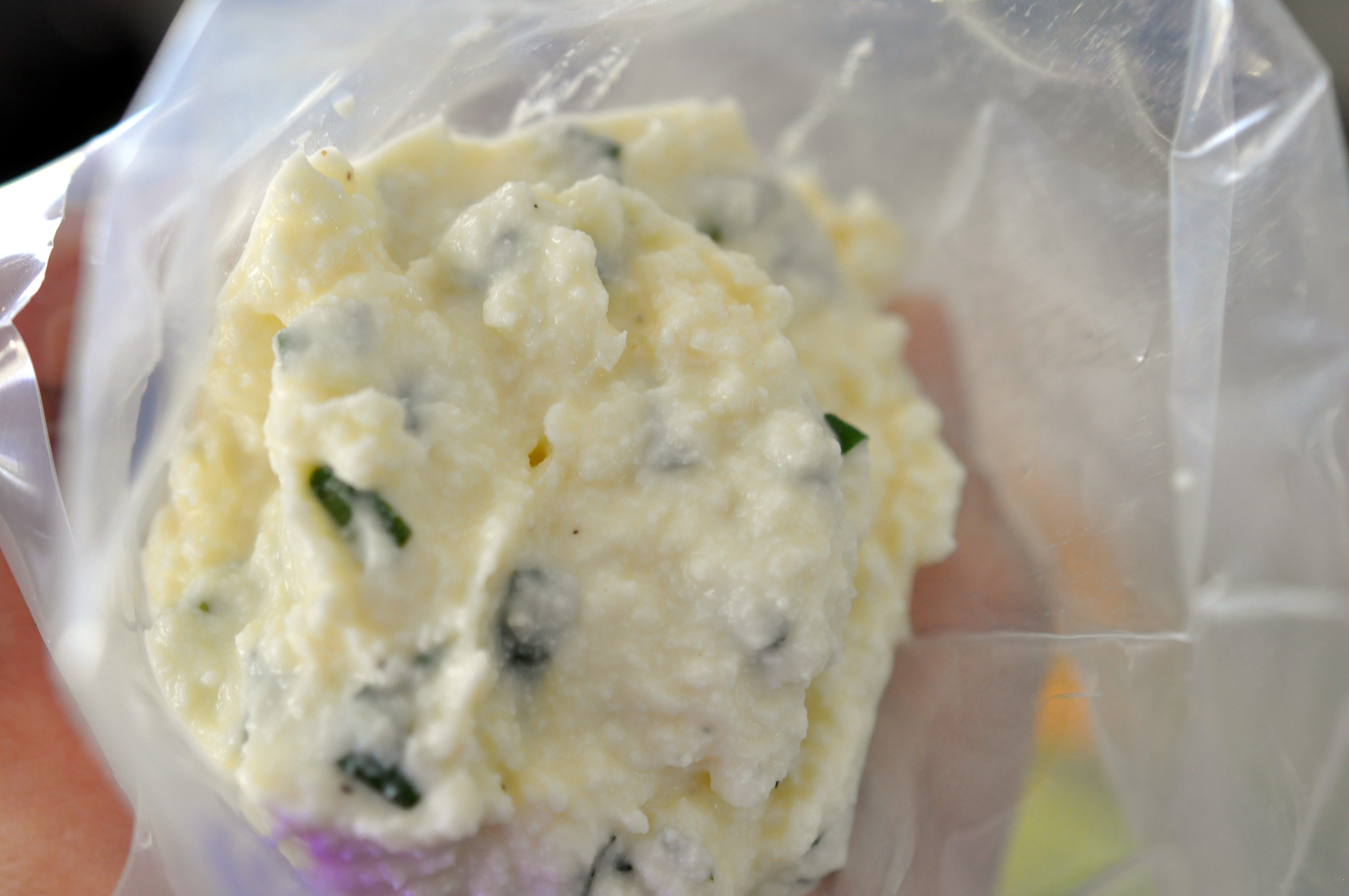 Pipe about a tablespoon of the cheese mixture into each flower. If you fill them too much they’ll ooze when you fry them. Twist the tops to close them up around the filling.