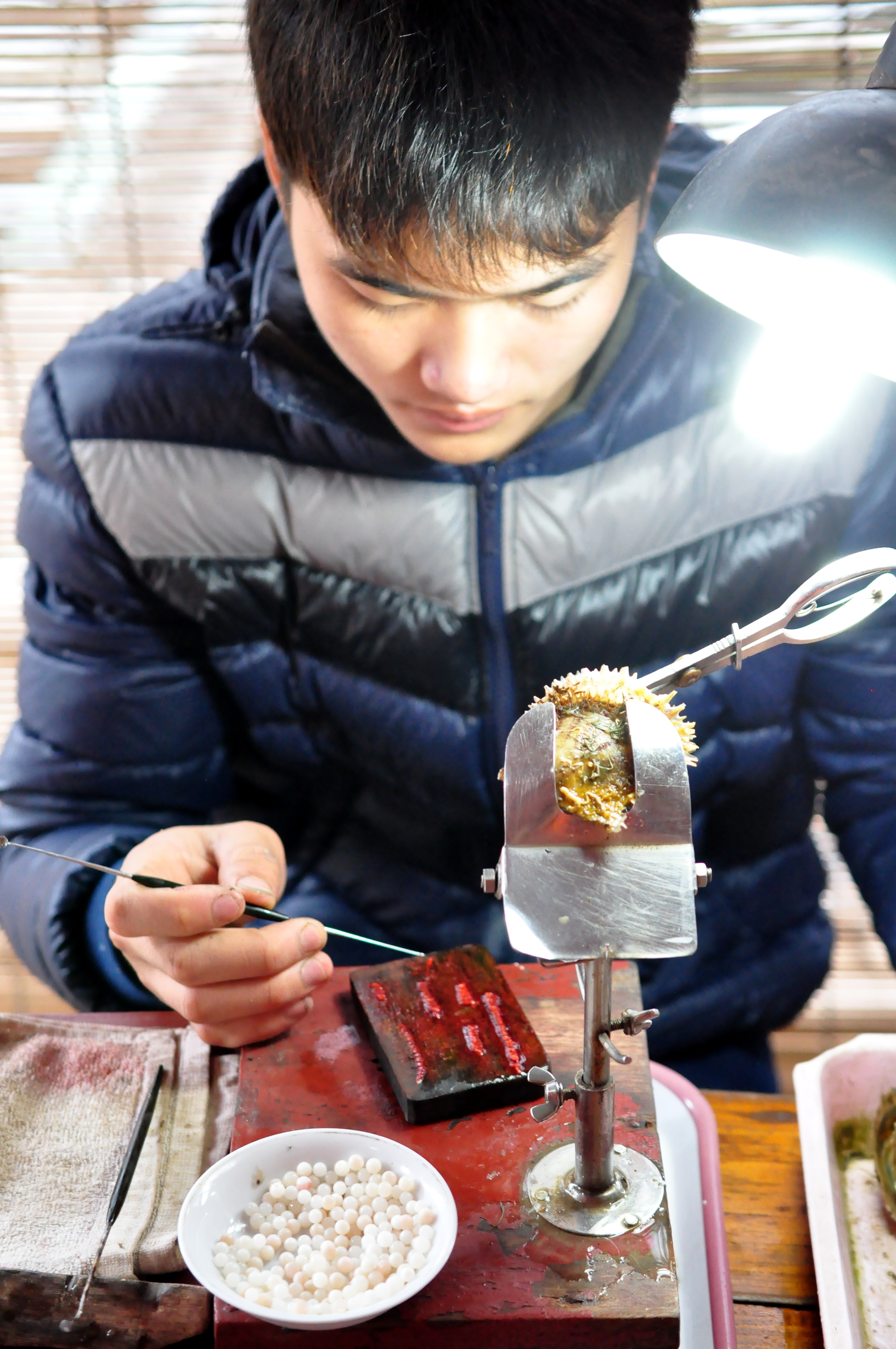 Seeding oysters on the Pearl Farm, Ha Long Bay: