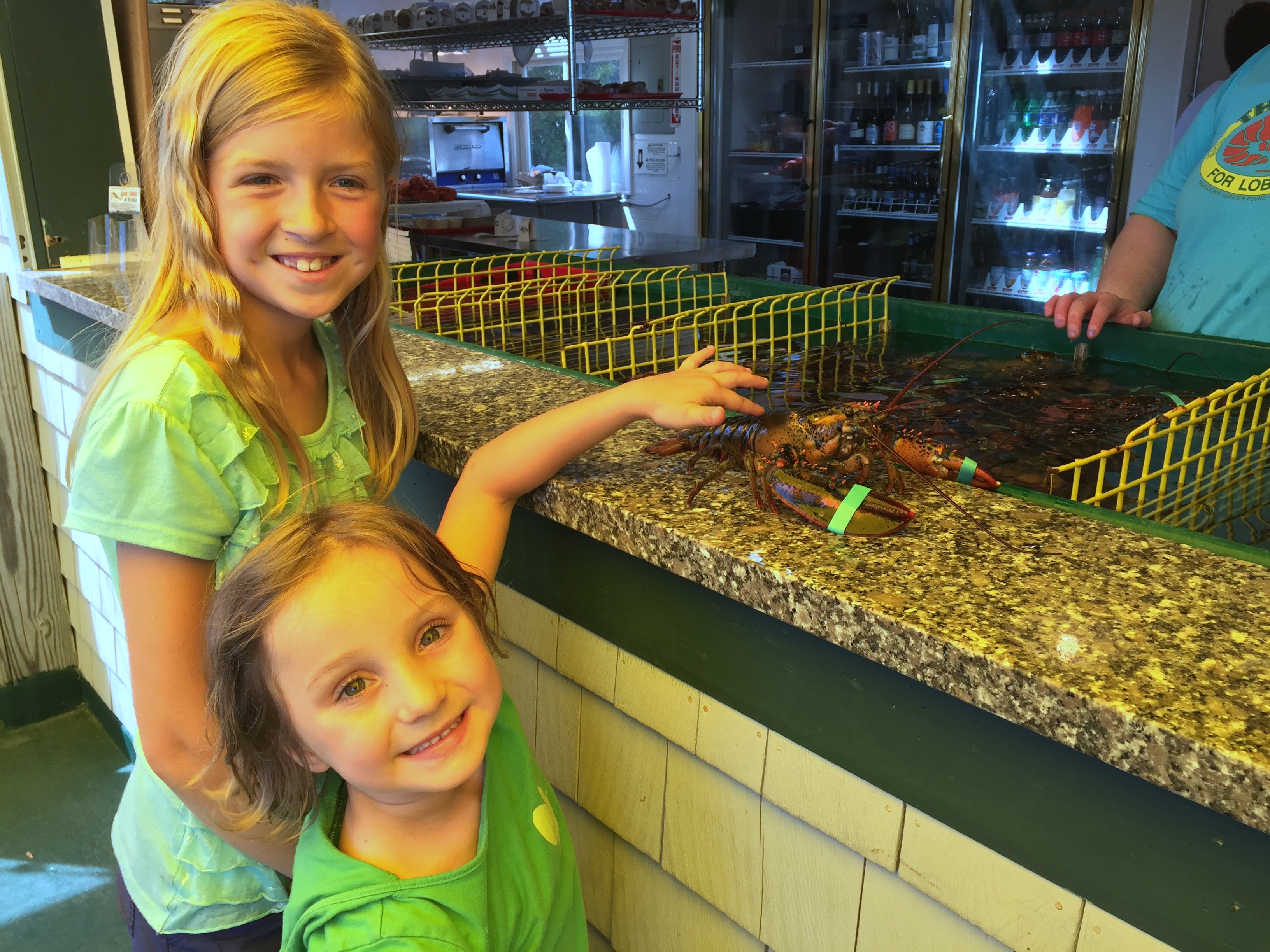 Thurston’s came highly recommended to us. We figured the only real way to become lobster roll connoisseurs was to try one everywhere we went, so off to Thurston’s we trouped. Lilly made it through our whole time in Maine without tasting lobster but she sure did like seeing them. And the kind lady behind the counter let the girls pet them!: